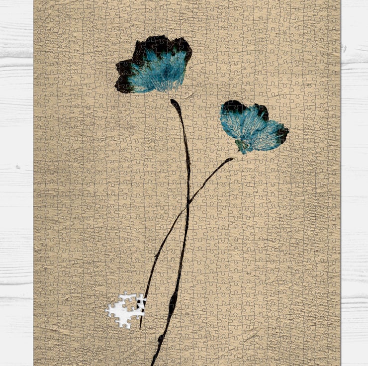 Both evocative and whimsical, this wonderfully complex floral jigsaw puzzle will transport you to an era of romance and folklore. A parchment colour canvas sets the background for these exotic turquoise black tipped flowers.