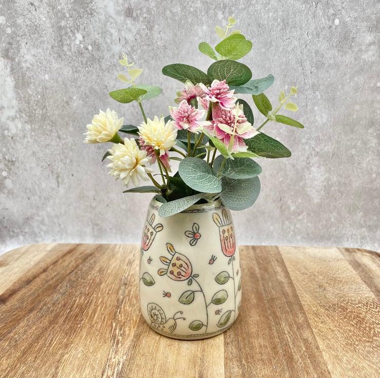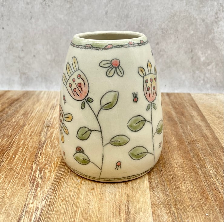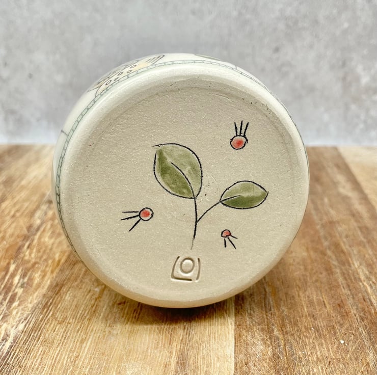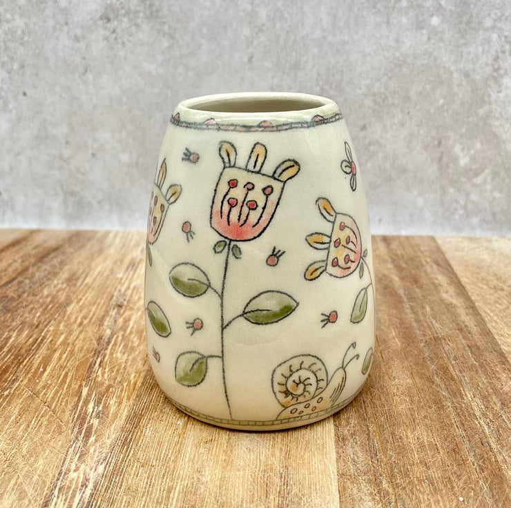 I’ve thrown this vase on the wheel in stoneware clay. It’s a durable, versatile and unique keepsake item. The hand carved and painted design incorporates abstract flower leaf stems with floating abstract seed heads in happy shades of pink, yellow & green. There’s also a little snail amongst the leaves. Being handmade, each item I make differs slightly, none are ever identical.