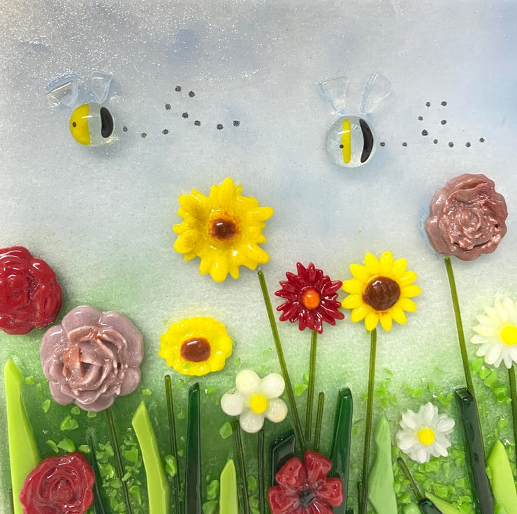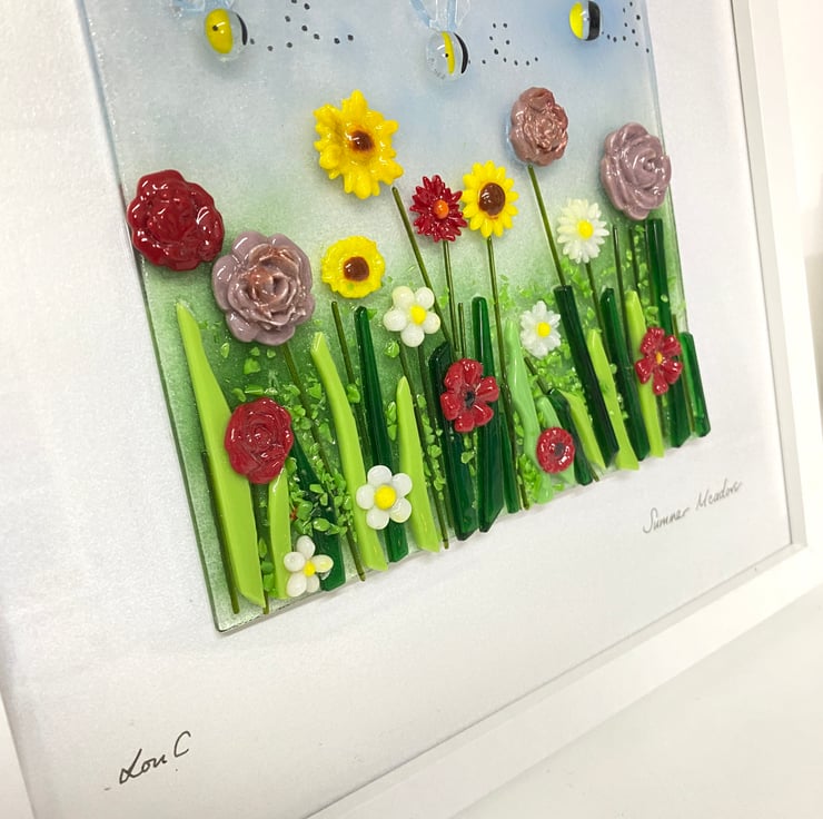The glass art is mounted on a 27cm white frame and would cheer up any wall in the home and also makes an affordable one of a kind gift .