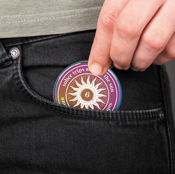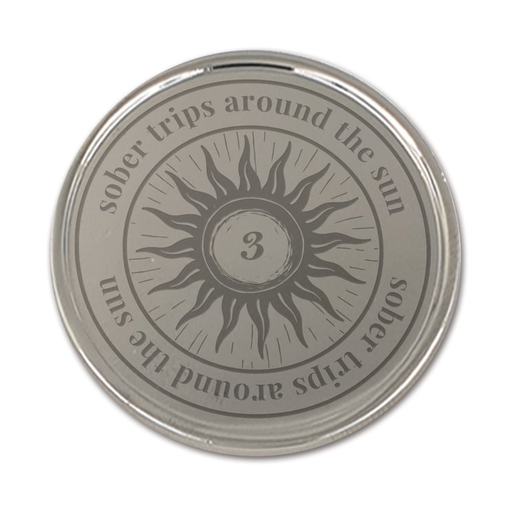 Looking for a meaningful way to commemorate your journey of sobriety? Our engraved metal sobriety coin is the perfect keepsake! Crafted with precision and care, this coin features the inspiring phrase "(Number) Sober Trips Around the Sun," symbolising each year of your remarkable journey towards a healthier and happier life.