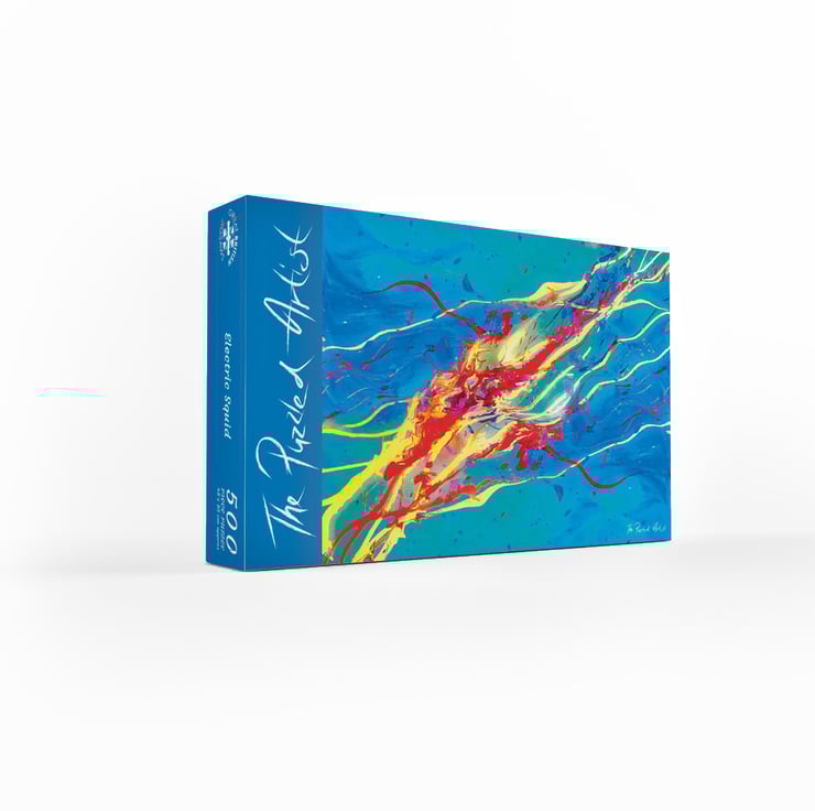 A fantastical aquatic abstract art jigsaw puzzle. Lightening bolt like tentacles shoot across the vibrant turquoise ocean. The mirrored corners add beautiful complexity to this small but mighty jigsaw puzzle.