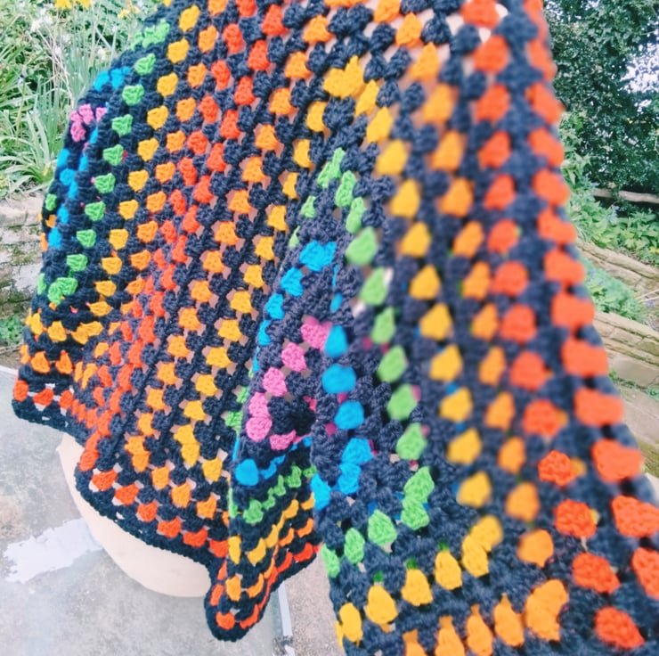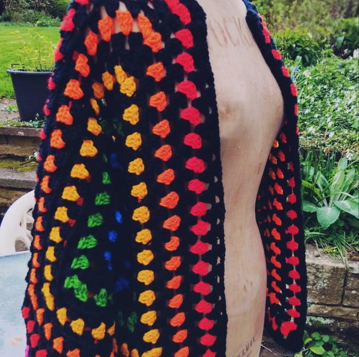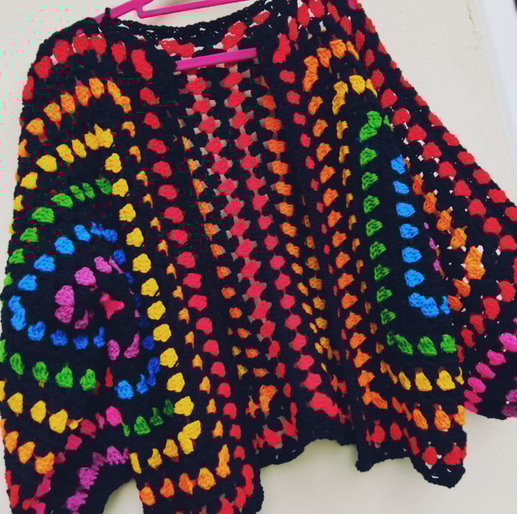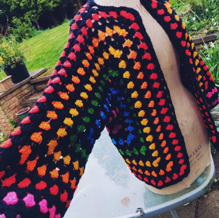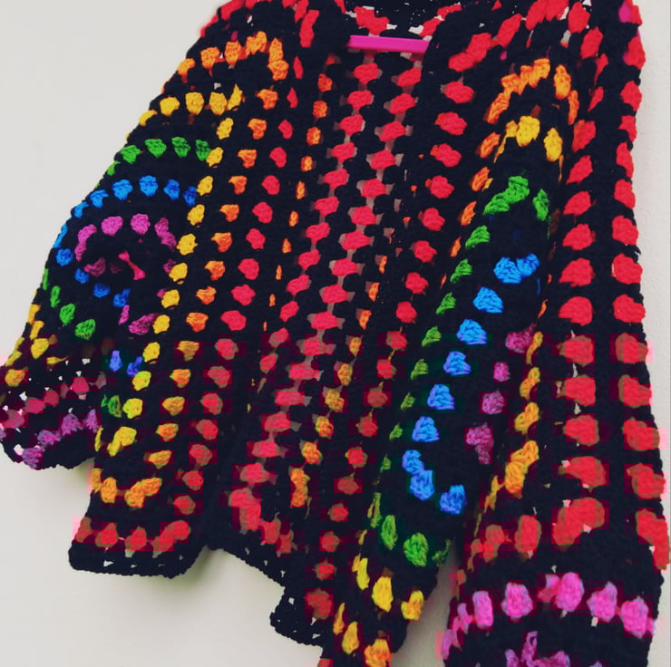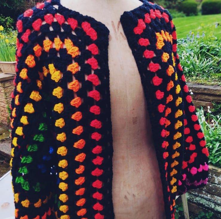 Crochet hexagon cardigan in a vibrant rainbow of colours.