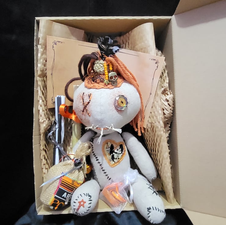 Maud comes with a little bag of tokens and charms that have protective intentions. She has a selection of pins that have their own pincushion in the shape of a sack and a spell candle to help you focus.