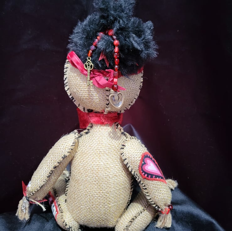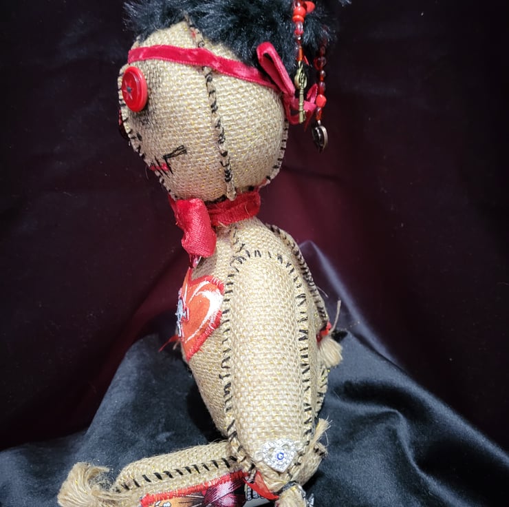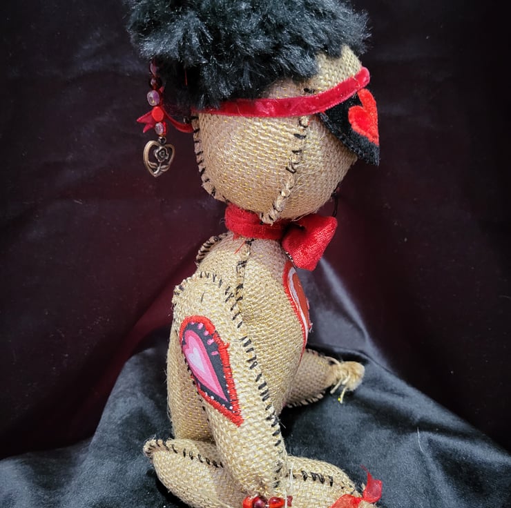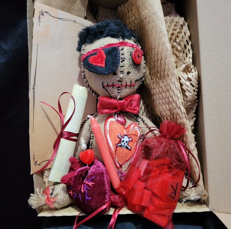 Valentine comes with a bag of runes and a lucky focus stone. He has a selection of pins and a pincushion in the shape of a heart and a spell candle to help you focus. He has his own official adoption certificate and his own reference number. Although other dolls will be similarly made, Valentine will always be a one off and will not be repeated.