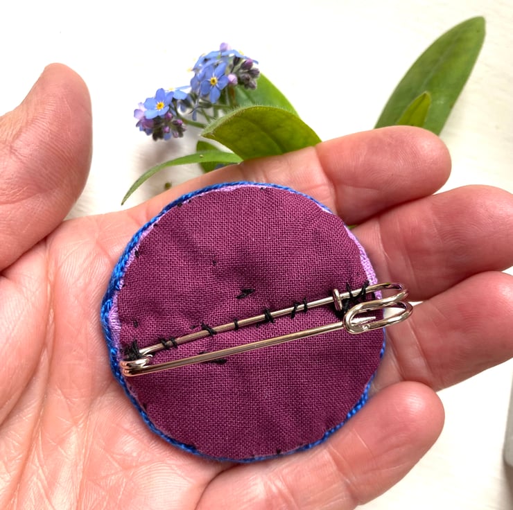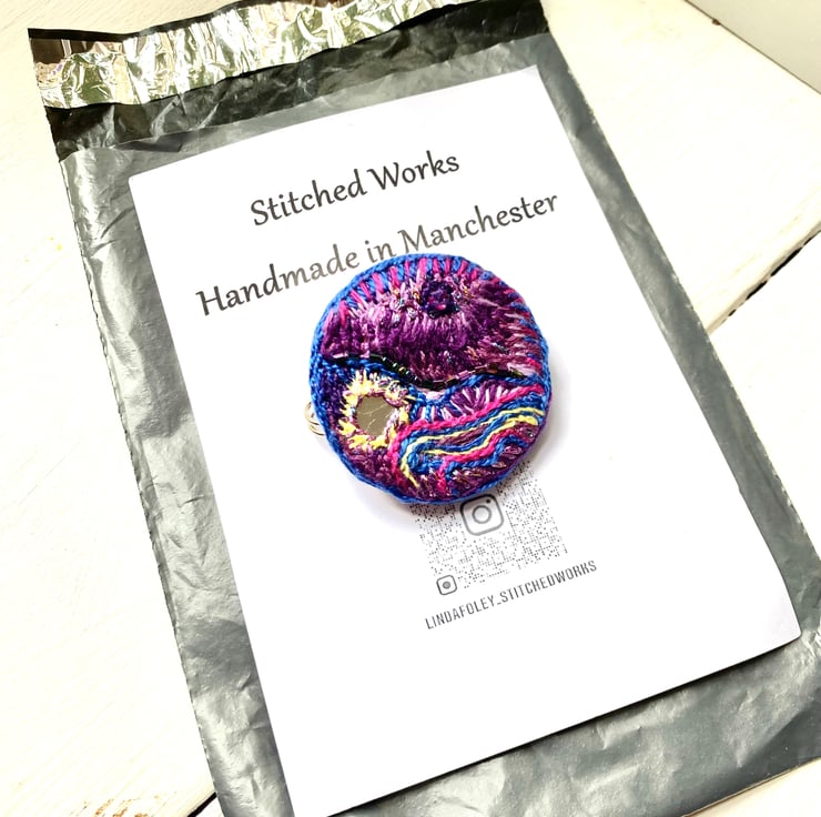 The hand embroidered fabric is stretched around a metal disc insuring it keeps it’s shape, a sturdy pin is sewn onto the back.