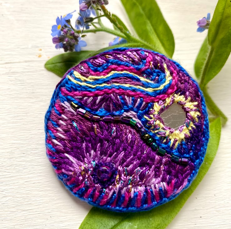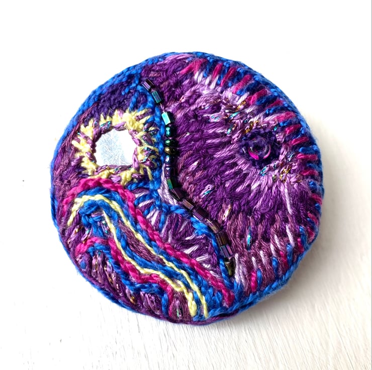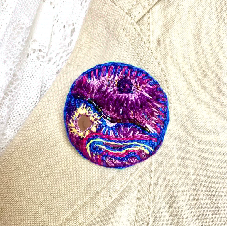 Hand Embroidered Circular Brooch, Vibrant purples