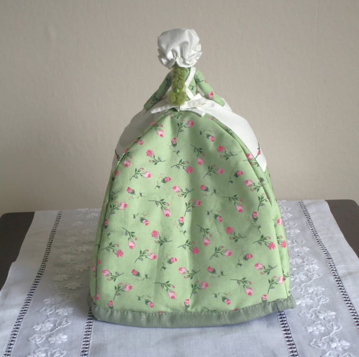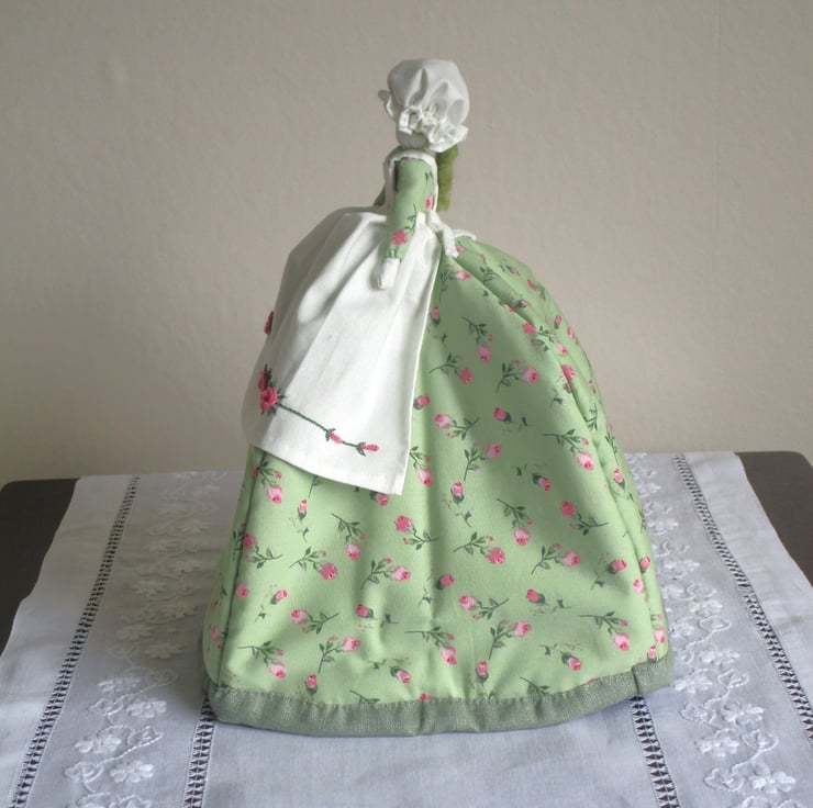 Her dress acts as a Tea cosy, which is made with 4 pieces of fabric, forming a square base, that fits over the teapot. I used 4 layers of textiles, including wadding, to keep your teapot hot for long a time.