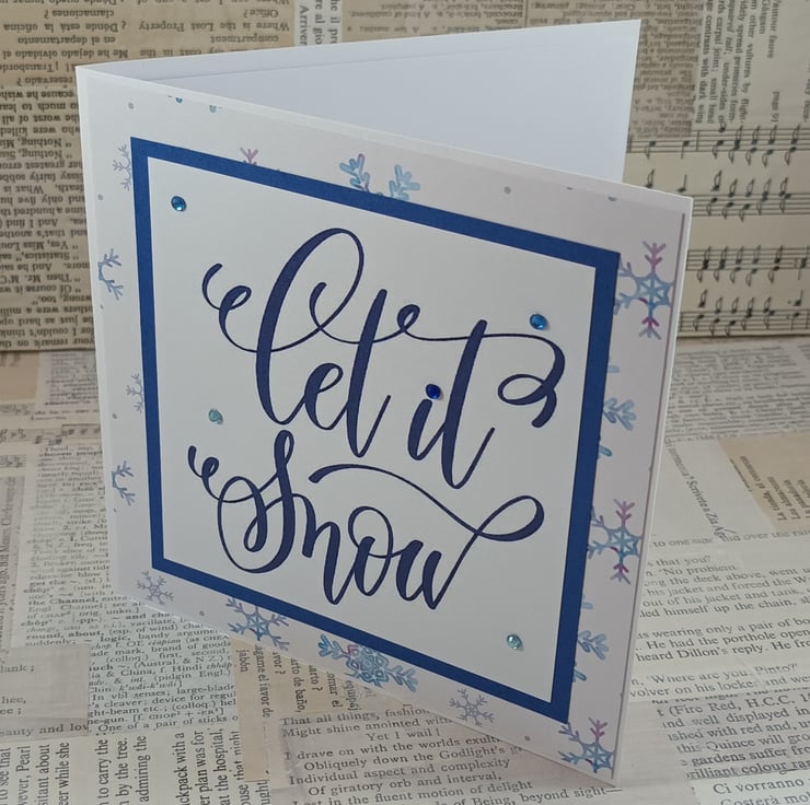 Square handmade Christmas card featuring the phrase 'Let it snow' printed in blue ink using a swirly font. The text has been mounted onto dark blue card, over a background of snowflakes and embellished with adhesive gems.