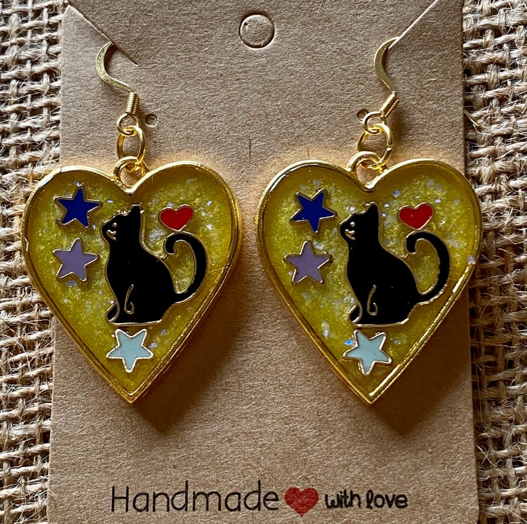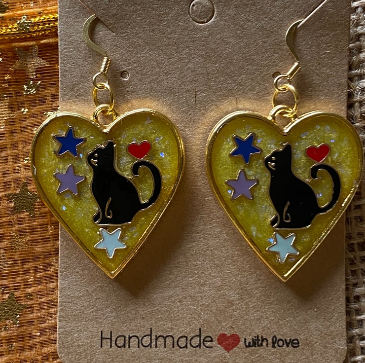 This is a pair of handmade gold-rimmed heart-shaped love your cat earrings. The background consists of a sparkly yellow mica in resin and a black enamel cat with a heart. It is surrounded by coloured enamel stars. The hooks are made from 18ct gold. They are presented in a lovely organza bag. They are posted via 2nd class Royal Mail post.