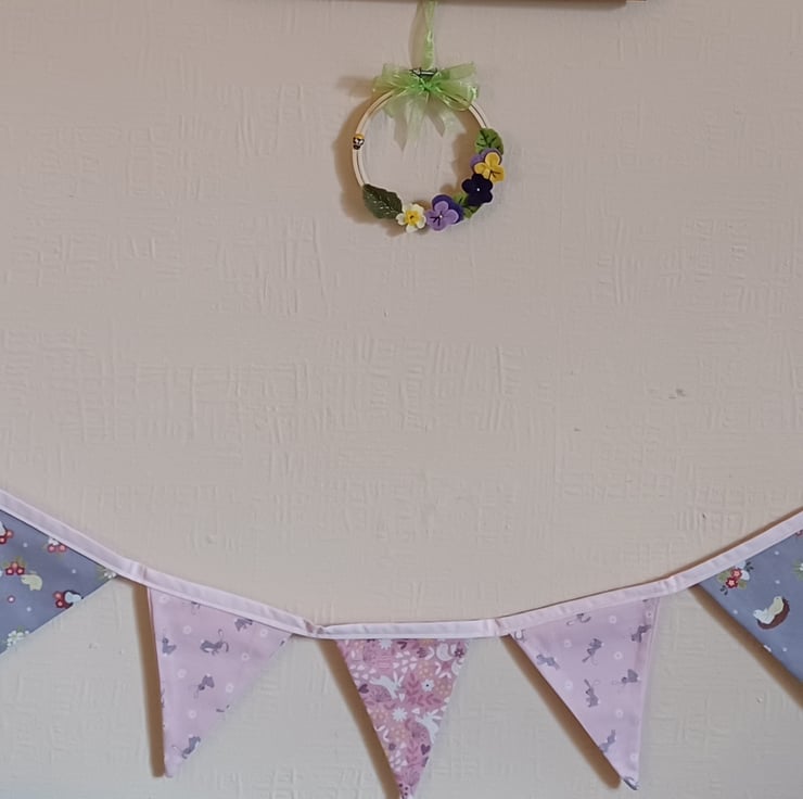 Sewn onto a handmade binding, also 100% cotton, each length is about 1.7 meters - that's just over 5ft - with a matching elastic loop on each end for easy hanging wherever you want a bit of bunting cheerfulness!