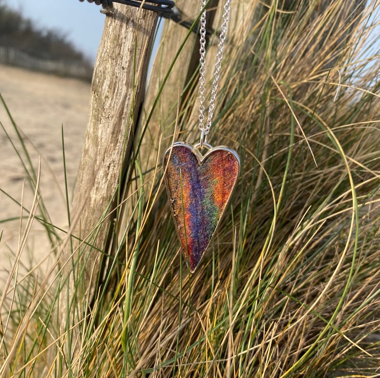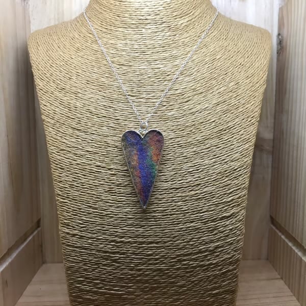 Handmade rainbow wool felt encased in a silver coloured heart pendant. This hangs on a silver plated chain.