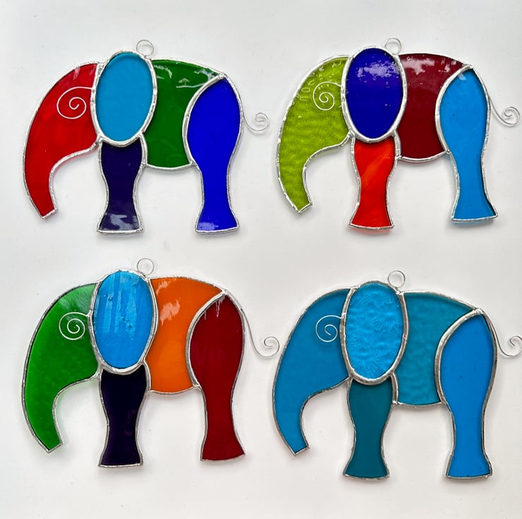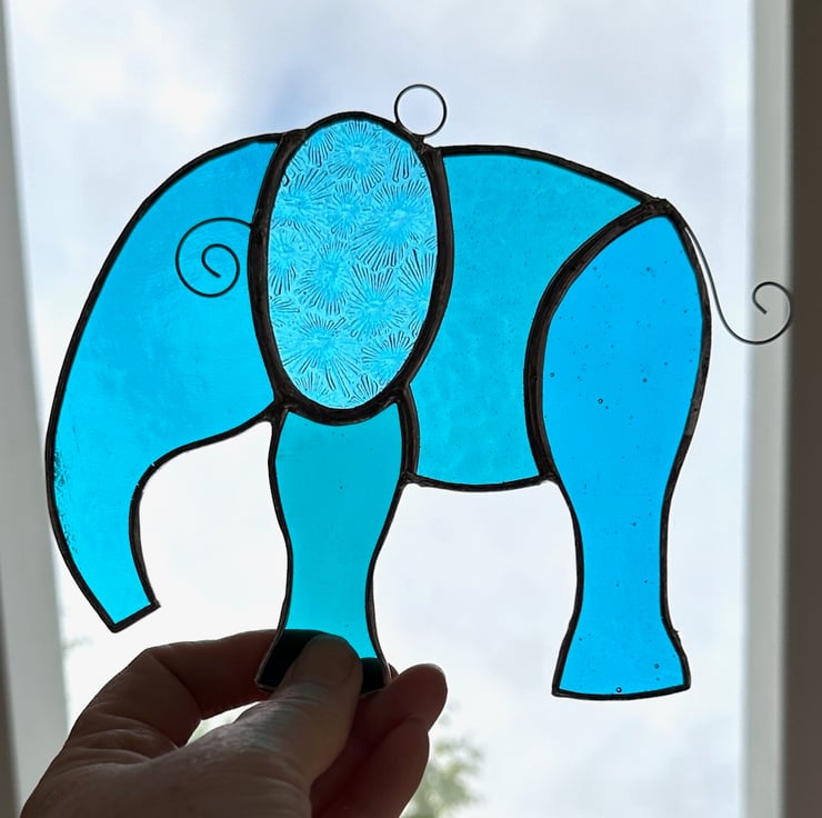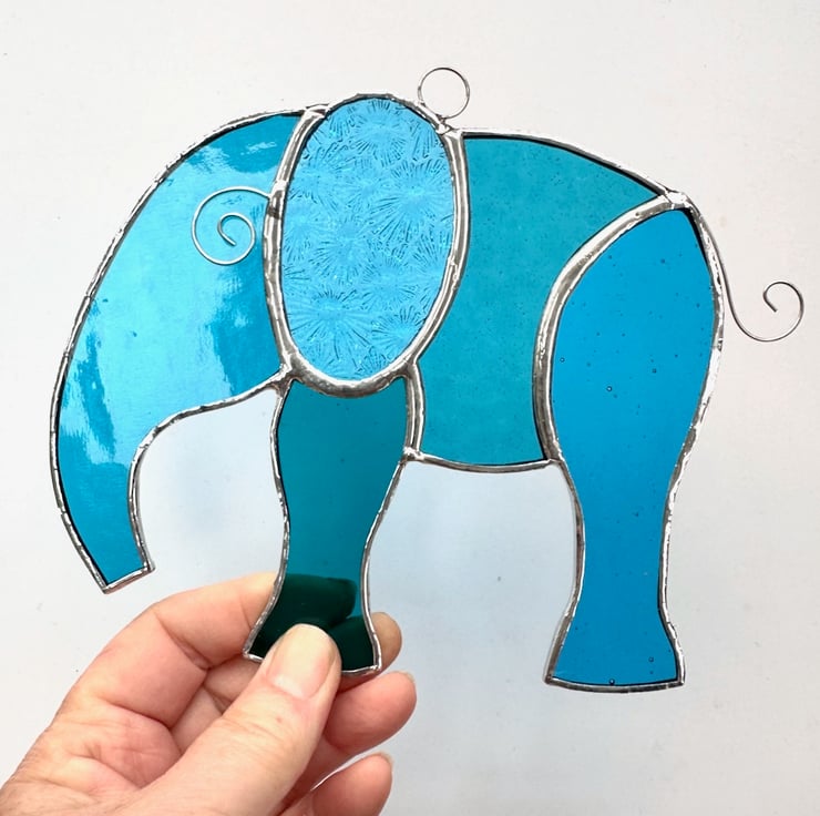 This glass elephant suncatcher has been made using 5 different types of turquoise and teal stained glass.