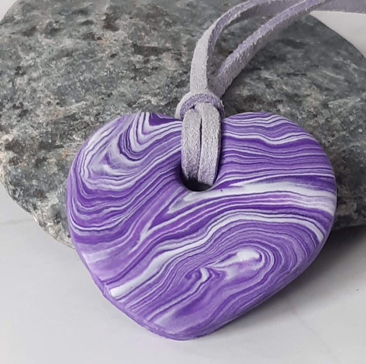 A heart shaped pendant handmade from a blend of bright purple and white polymer clay to create a unique swirl design.