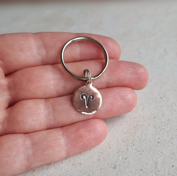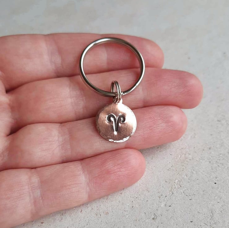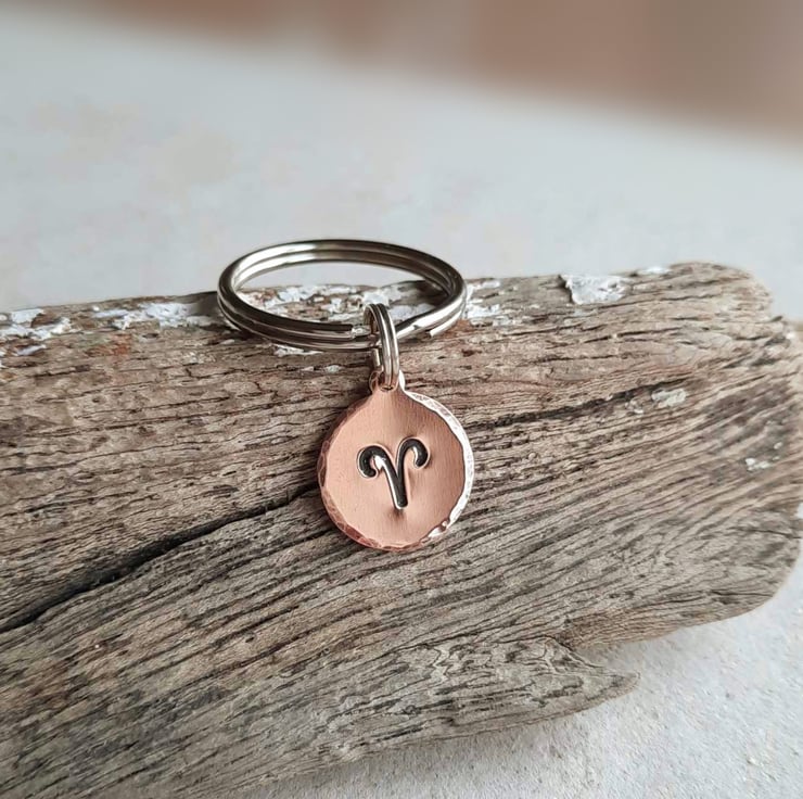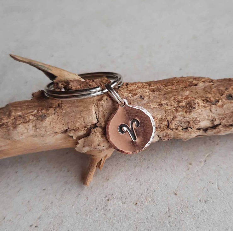 This small copper key ring is hand stamped with the zodiac symbol for the star sign of Aries and the edge is gently hammered to add a pretty texture. The charm is oxidised with a patina to highlight the details.