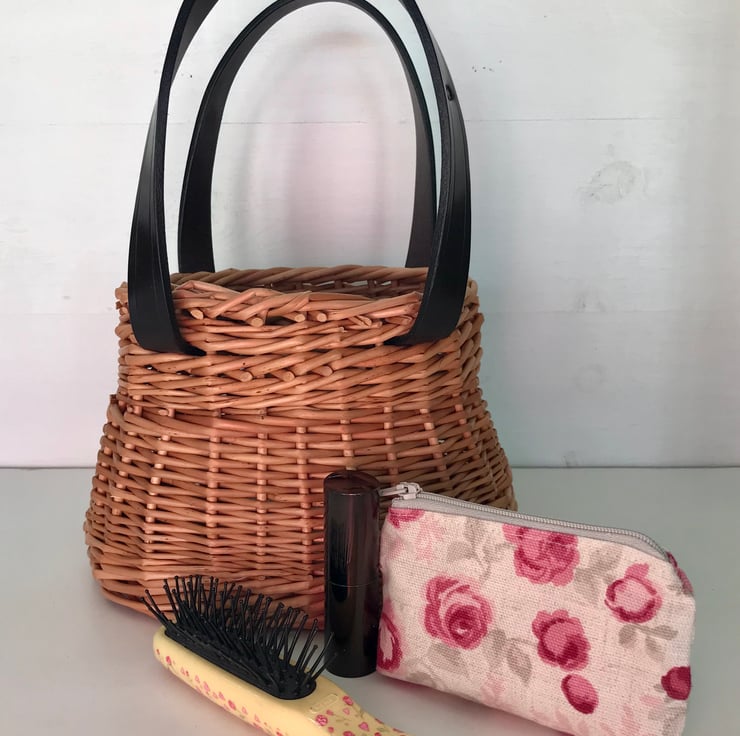 A classy, uniquely shaped, small oval willow basket woven from buff willow, perfectly complemented by quality Sedgwick English leather handles handmade by my friend Becs Ball from Bosorne Leatherwork in Dark Havanna English Sedgwick leather.