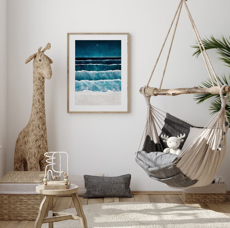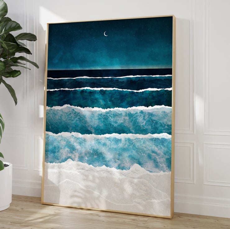This ocean print is a reproduction of my original mixed media artwork created using watercolours, stencilling and photography which has been collaged and digitally tweaked to bring together the final composition.
