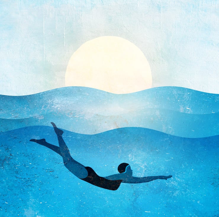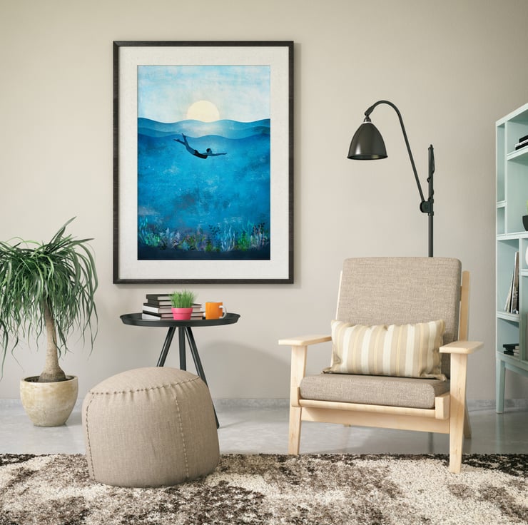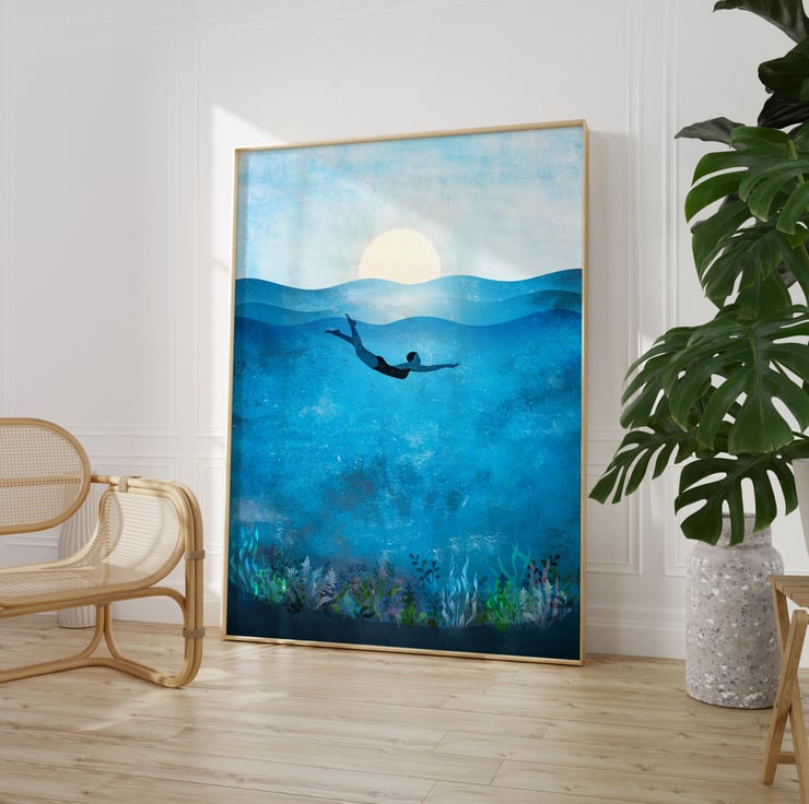 This wild swimming print is a reproduction of my original mixed media artwork created using watercolours, stencilling and photography which has been collaged and digitally tweaked to bring together the final composition.