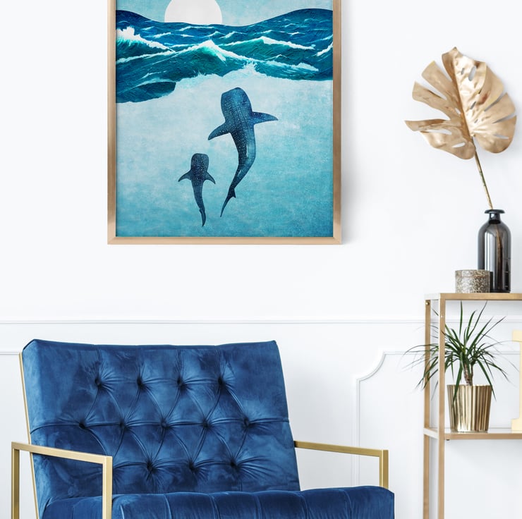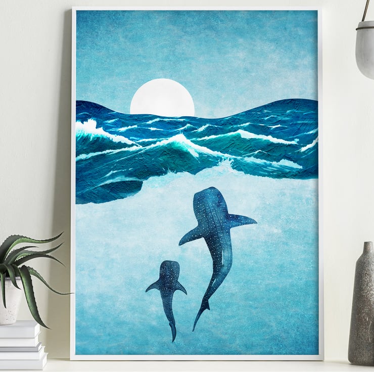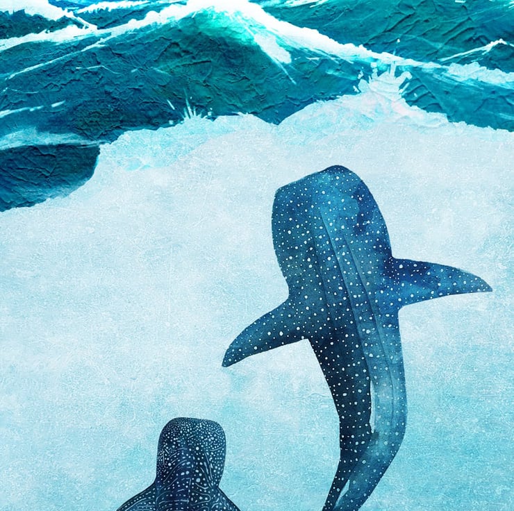 This whaleshark print is a reproduction of my original mixed media artwork created using watercolours, stencilling and photography which has been collaged and digitally tweaked to bring together the final composition.