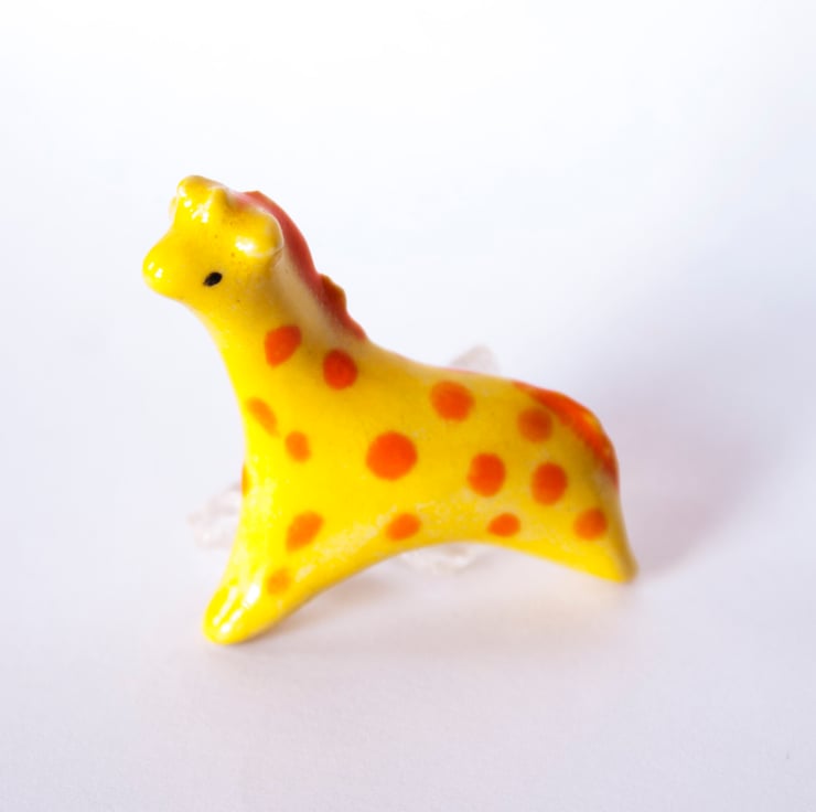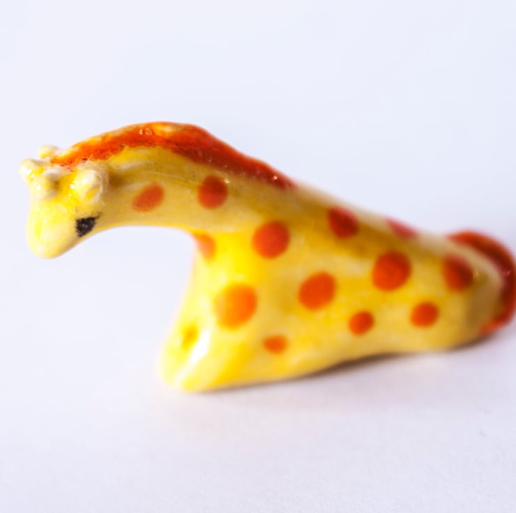A vibrantly coloured tiny giraffe figurine made from white clay. The Giraffe has a minimalistic form and bright colour palette to convey the creature's characteristics in a cute and simplified design. I created this miniature by hand-forming the clay without a mold, and fired it in a kiln to 1200°c.