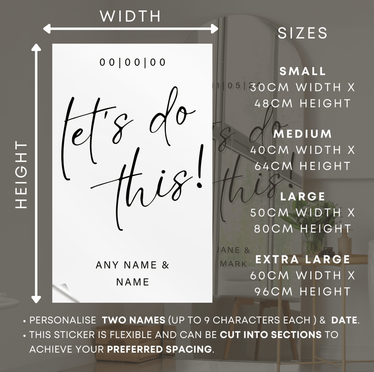 Elevate your wedding décor with our personalised sticker, designed to add a touch of charm and elegance to your DIY signs or mirrors! Available in a range of sizes and colours, this sticker allows you to customise your wedding signage to match your unique style and theme perfectly.