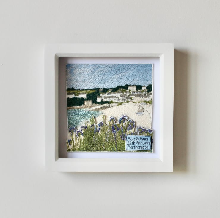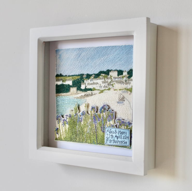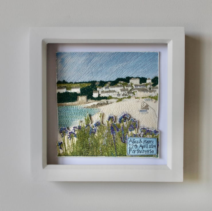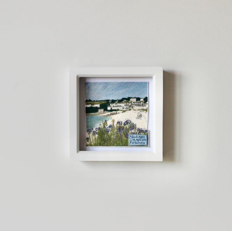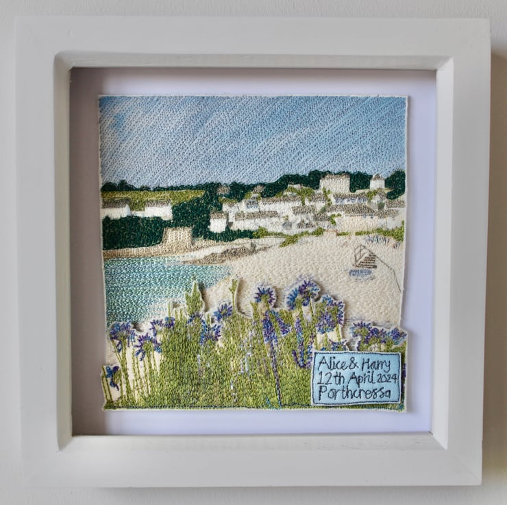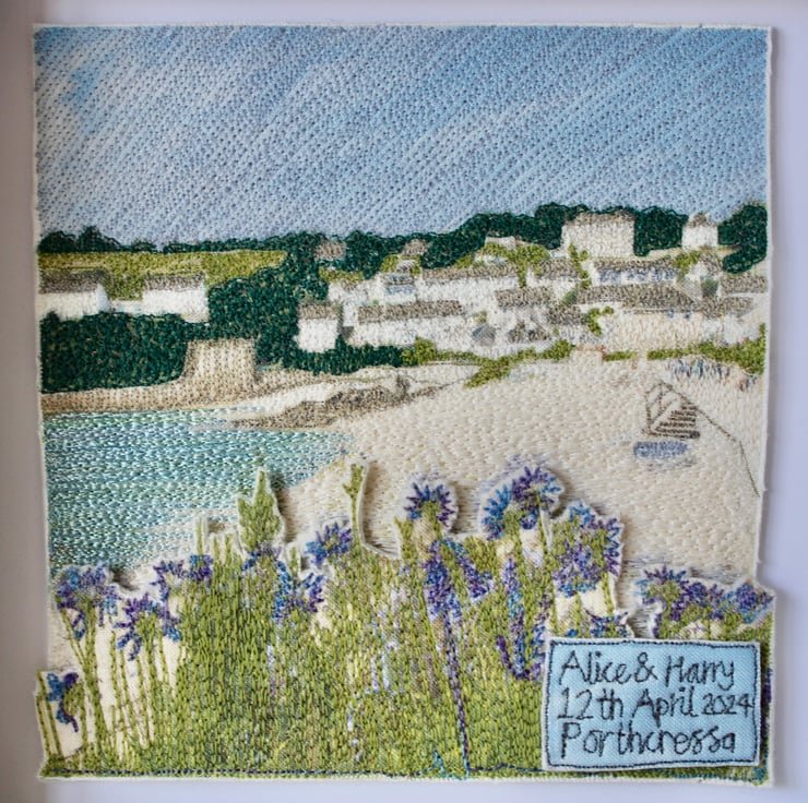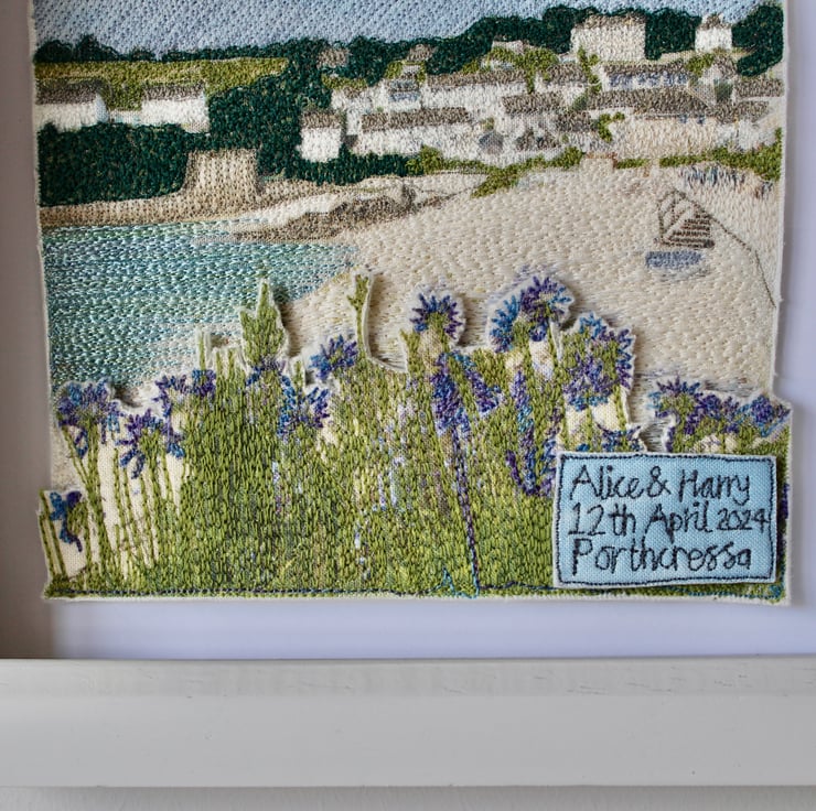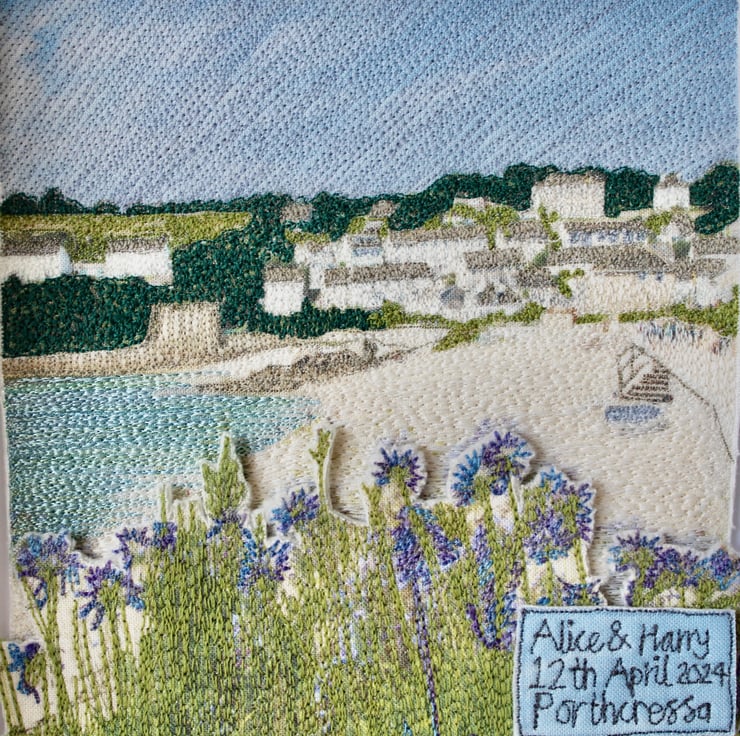 The Porthcressa view is created using layers of cloth and free hand machine embroidery.