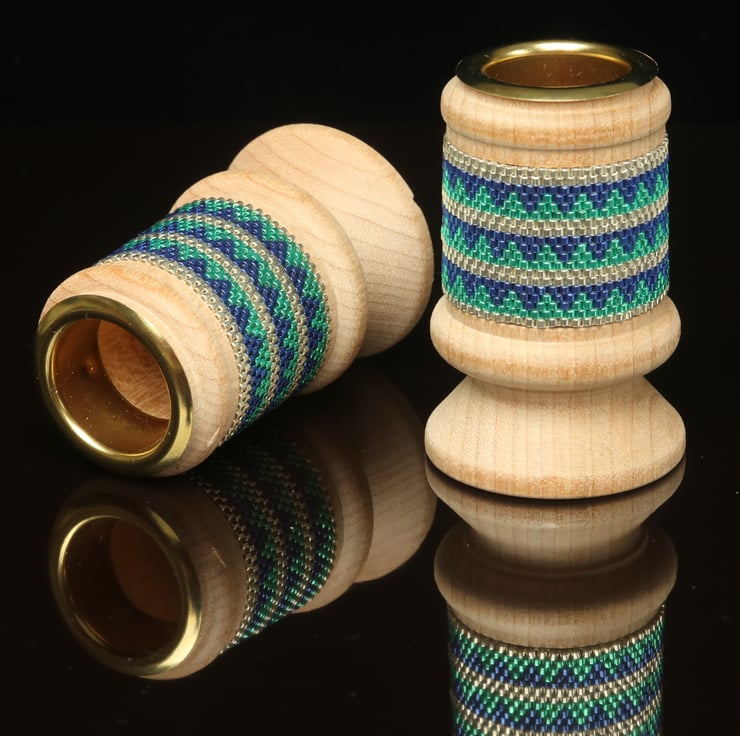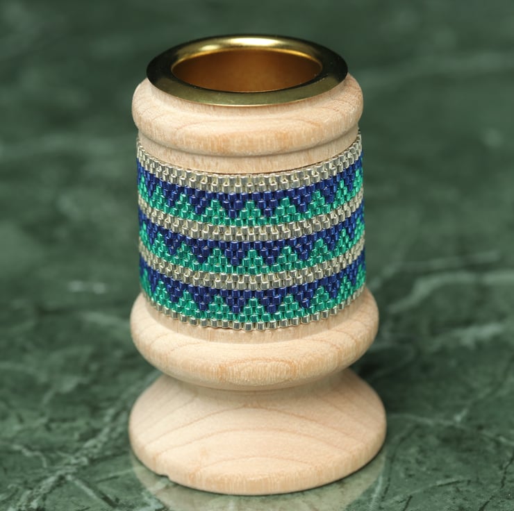 Add a touch of brightness to your home with this charming wooden candleholder, in lively blue, green, and silver colours. The securely stitched beaded band has been inspired by Aztec artwork and is made from shiny metallic beads. The pattern is my own design.