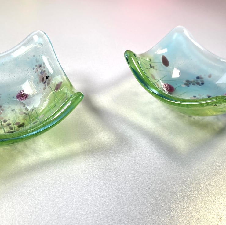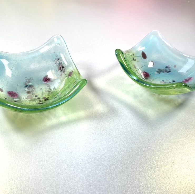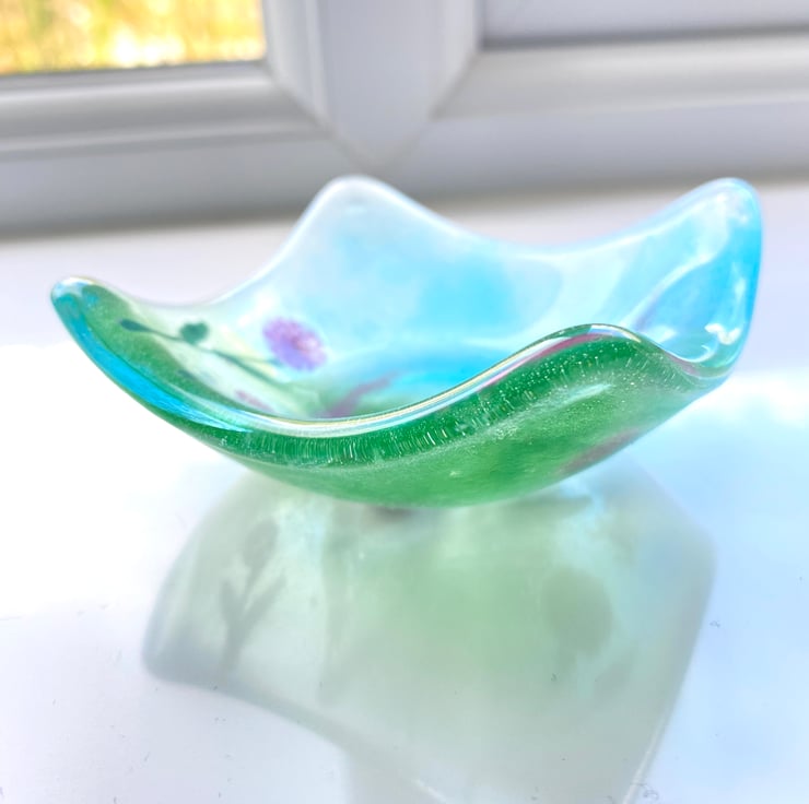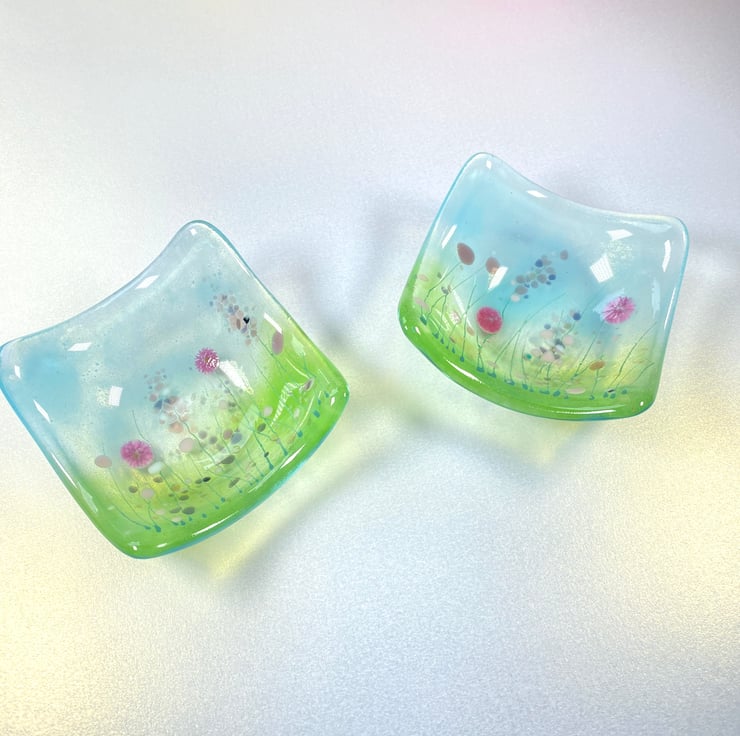 Floral fused glass trinket dish with gorgeous murrini flowers . This cute dish is perfect as an ornament or useful to keep small jewellry items in . It measures approximately 3.5 inch square .