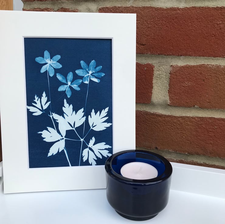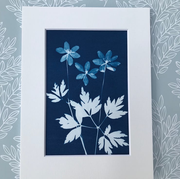 Botanical prints -This is what the sun sees in Cyanotype printmaking, it captures the beauty of nature in all its glory. By placing the pressed flowers onto a light-sensitive coated paper, then exposing it to sunshine, an image is created. These wood anemones loved sunbathing in their photo shoot. These pretty flowers on delicate stems tower up from lush foliage and herald the start of spring.