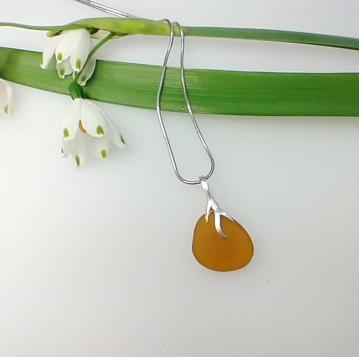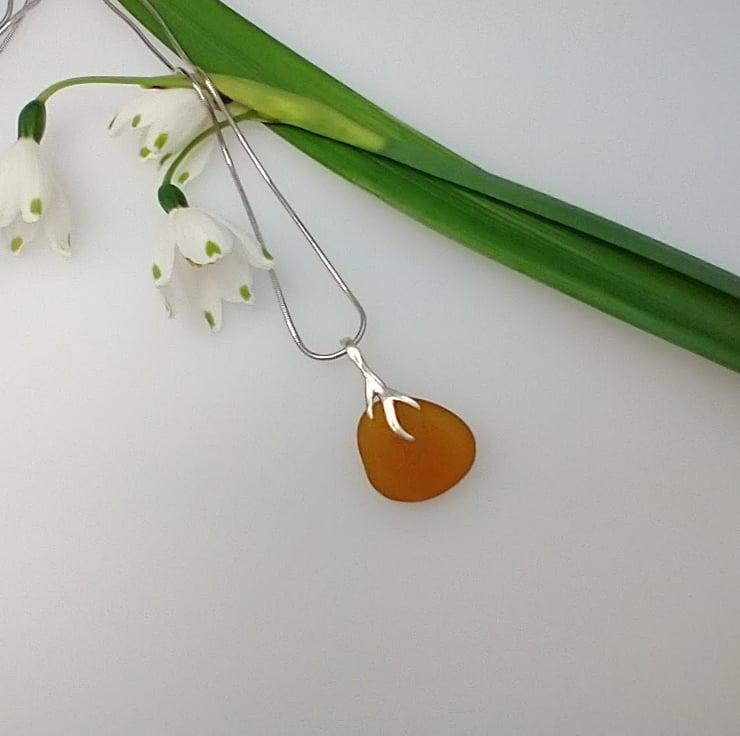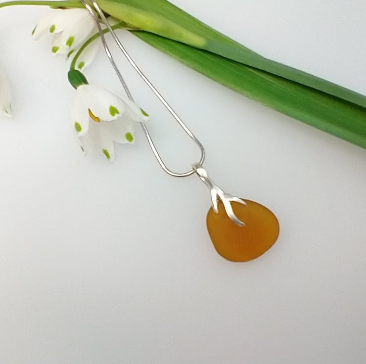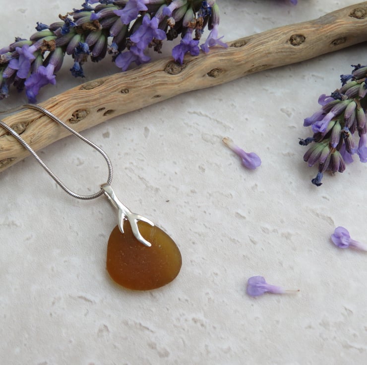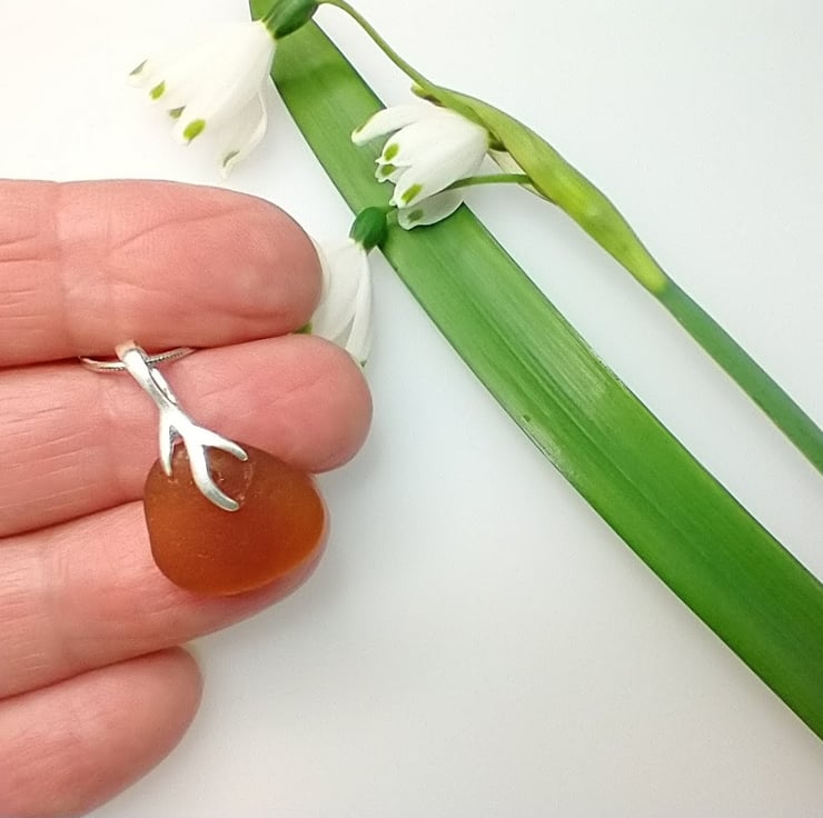 Naturally tumbled by the ocean, this brown sea glass on a sterling silver coral bail is suspended on a sterling silver snake chain. This sea glass has been hand picked from the beach at Seaham and washed in soapy warm water and drilled afterwards. No other treatment has been given to this pretty nautical necklace. Each piece of sea glass is different and no two pieces are the same as they all have different shapes and textures due to the random tumbling they are exposed to by the waves of the sea.