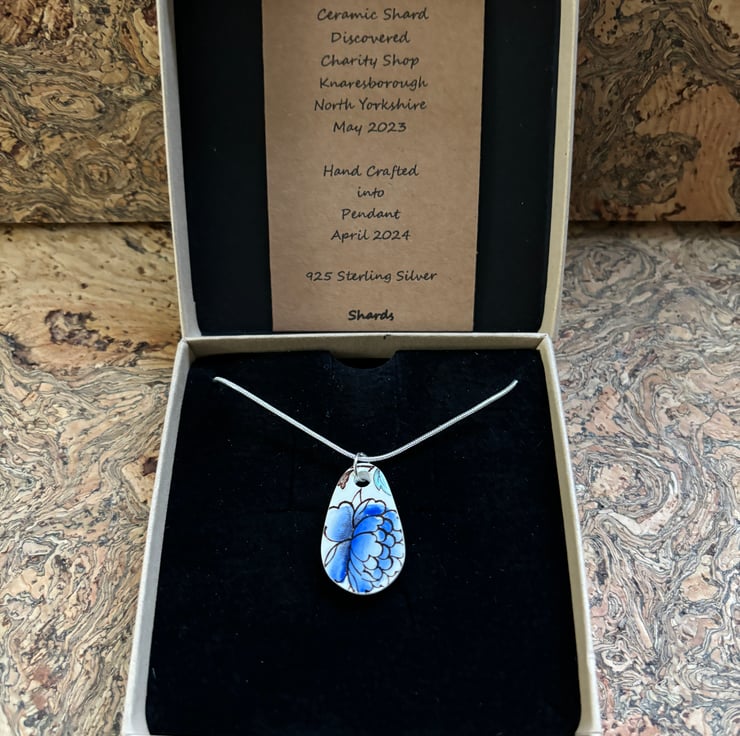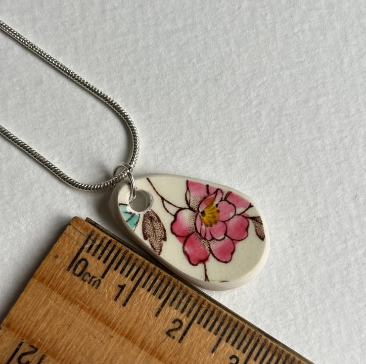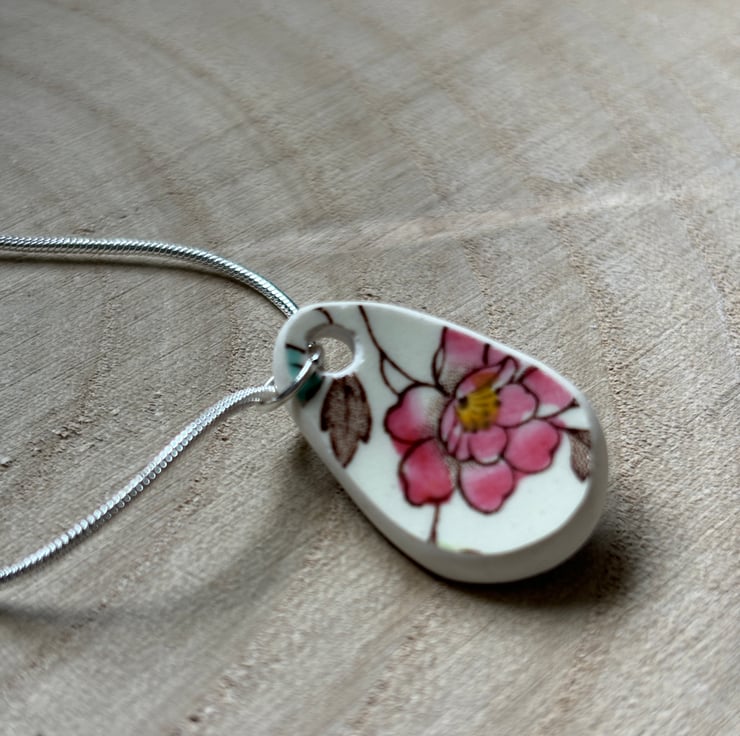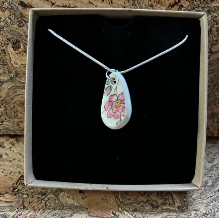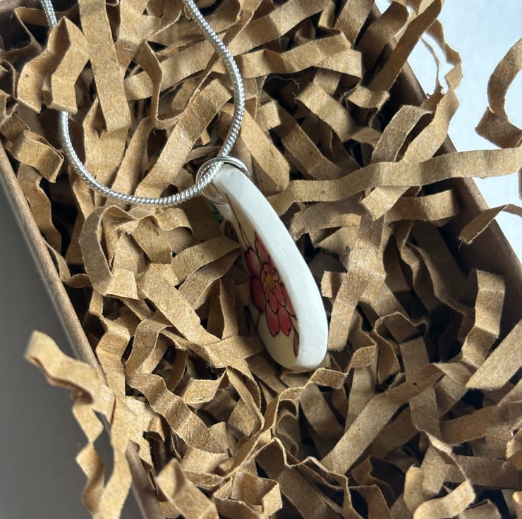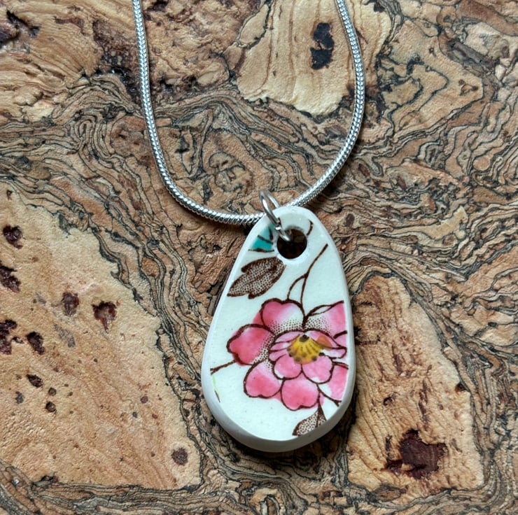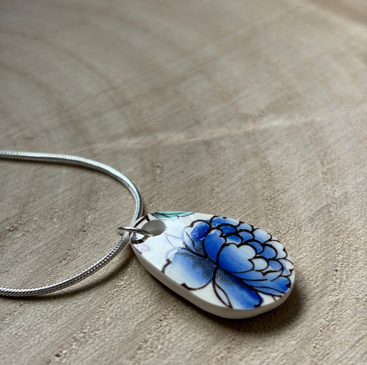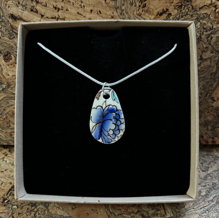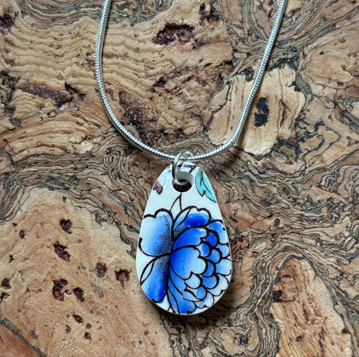 This pendant is made from the body of the cup, front a lovely blue flower, back slightly curved as its part of the inside is a pretty pink flower. I’ve sanded and smoothed the edges to create this unique necklace. Front and back glaze in tact, sides sealed with eco friendly matt sealant.