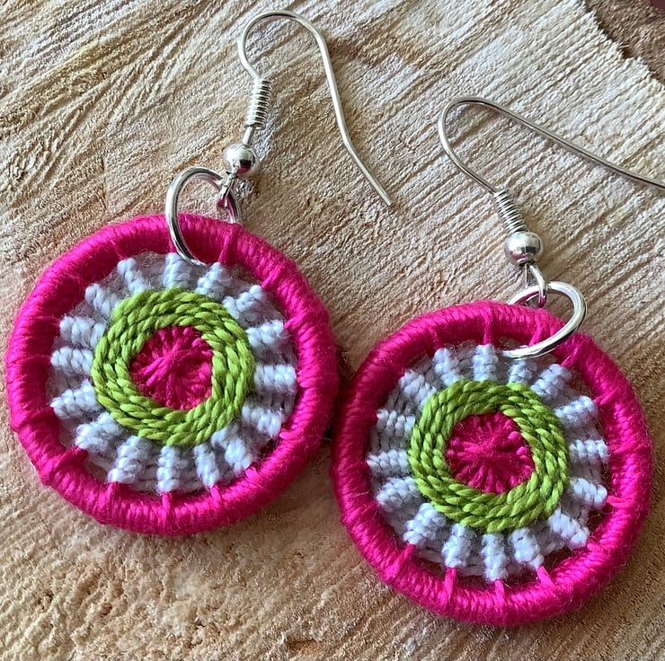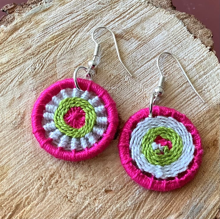 These earrings have been made by winding Cotton Perle thread around a metal ring. Each ring measures just over 2cm and hangs from silver plated earwires.