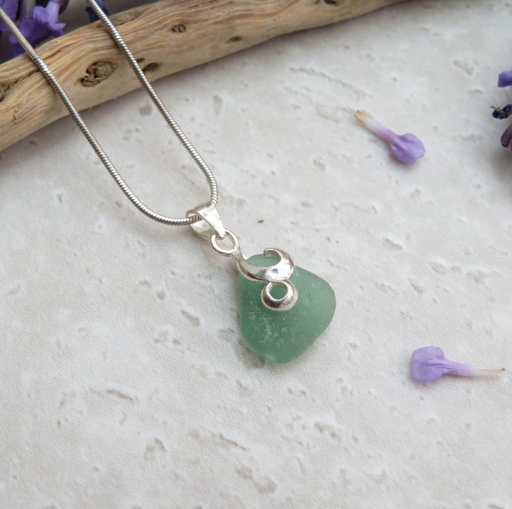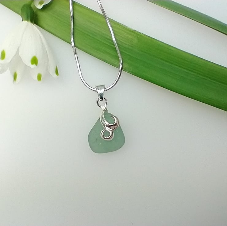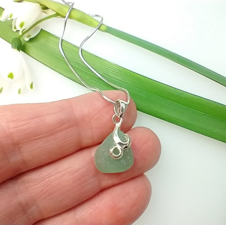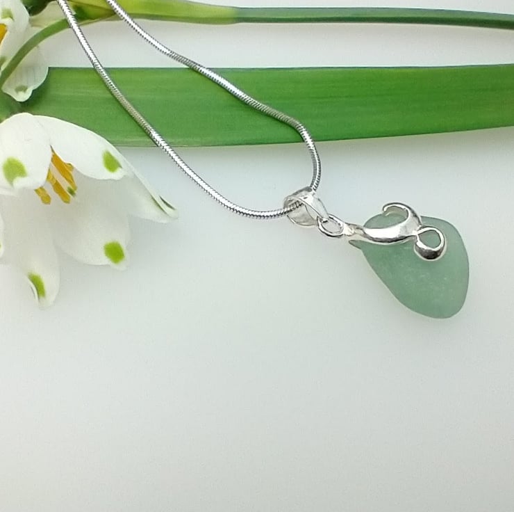 Naturally tumbled by the ocean, a dainty pastel mint green sea glass pendant on a sterling silver swirl bail suspended on a sterling silver snake chain. This sea glass has been hand picked from the beach at Seaham and washed in soapy warm water and drilled afterwards. No other treatment has been given to this pretty nautical necklace. Each piece of sea glass is different and no two pieces are the same as they all have different shapes and textures due to the random tumbling they are exposed to by the waves of the sea.