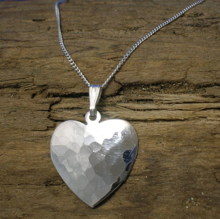 These beautiful heart earrings are handmade in solid Sterling Silver by Philip Tulley and feature a hammered (planished) finish which reflects the light in an interesting way.