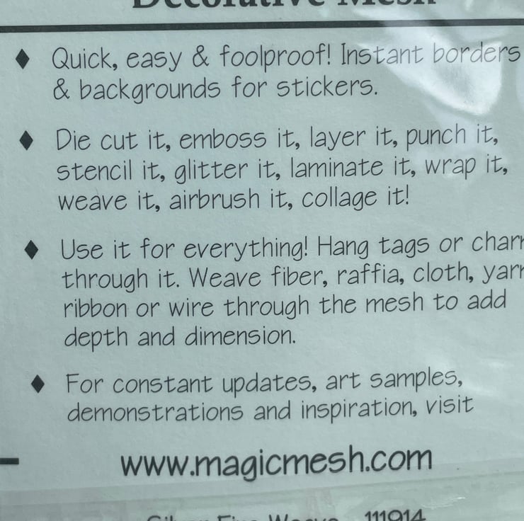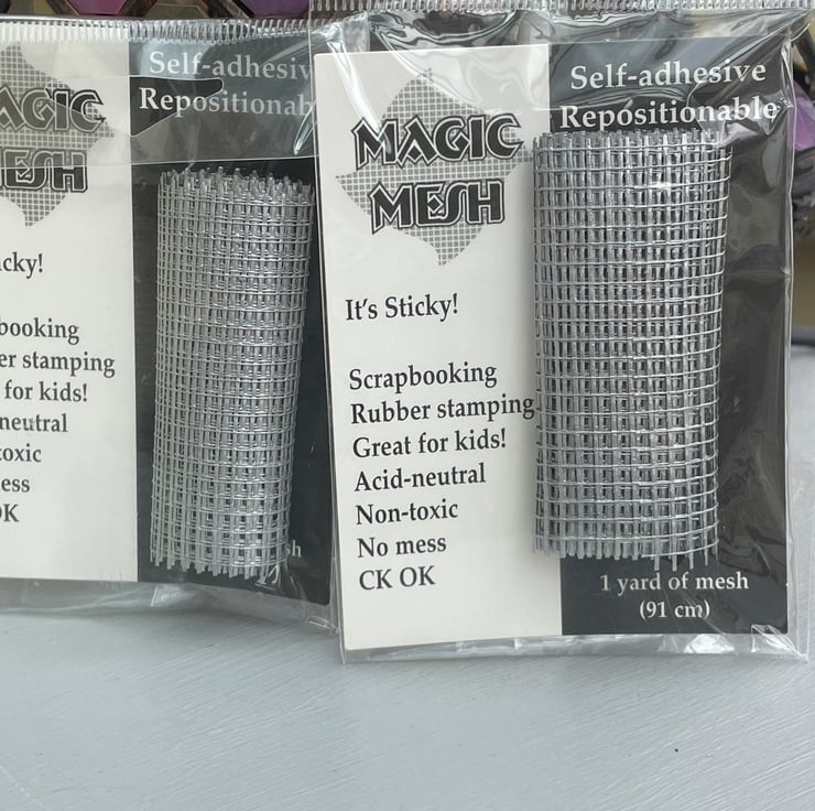 Two packets of self adhesive silver coloured mesh. 1 yard/91cm in each packet and can be used for many crafting projects, it can be die cut, embossed, punched, glittered painted and many more. Use on many surfaces. A lovely addition to your craft stash.