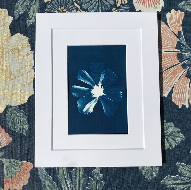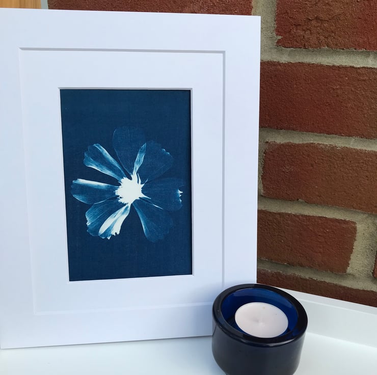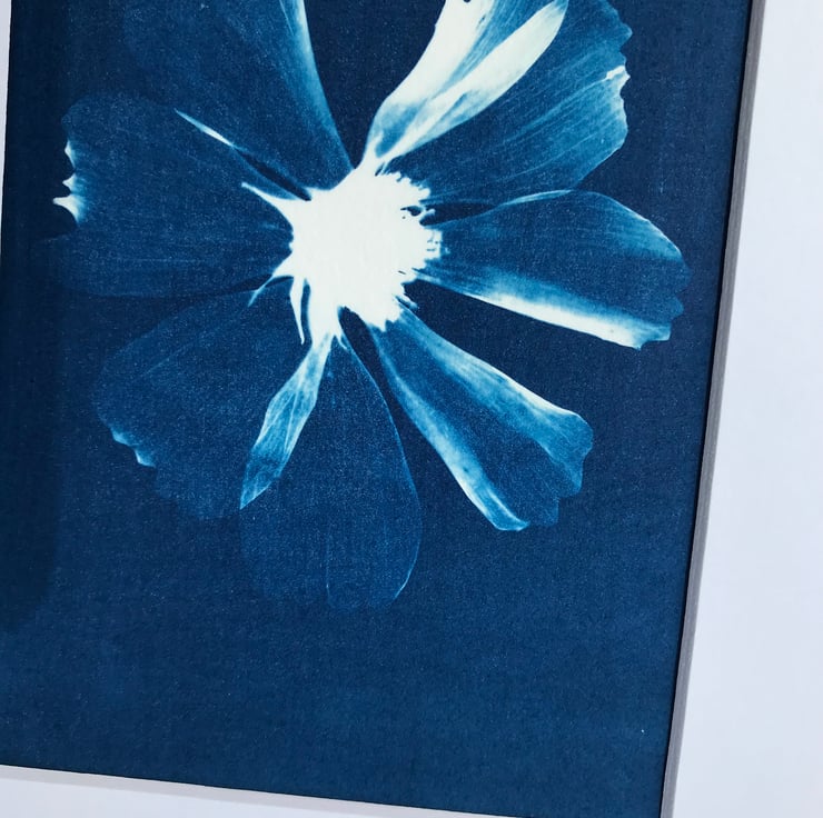 Botanical Art- Made using the traditional Cyanptype method and exposed for long enough to let some of her petal veining show through, this Cyanotype Original seems shy and unassuming. She does not mind which way up you display her, she won't make a fuss.