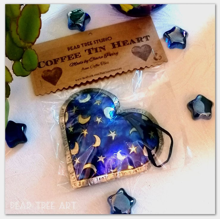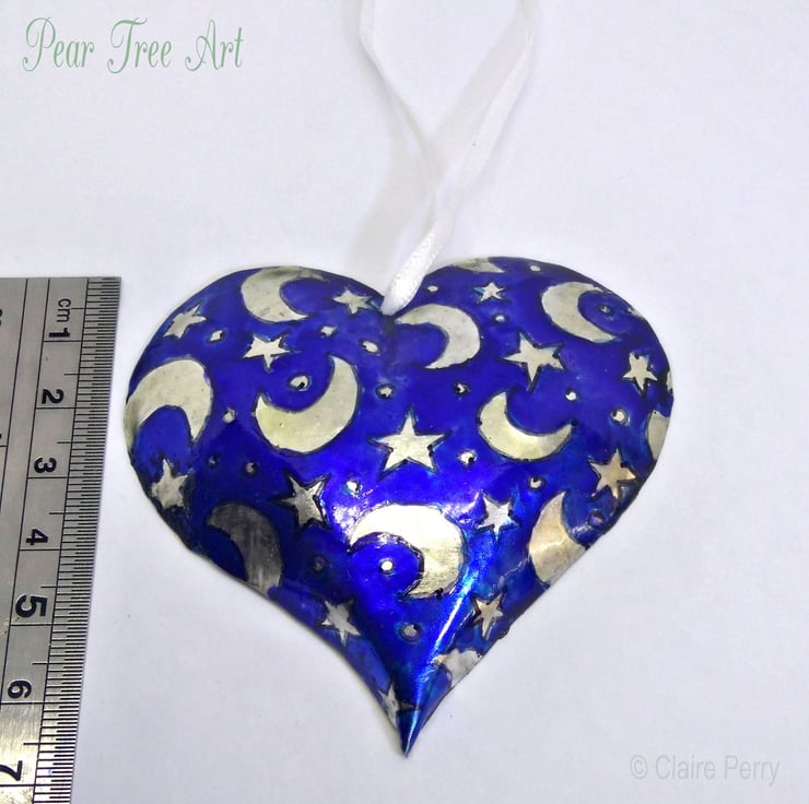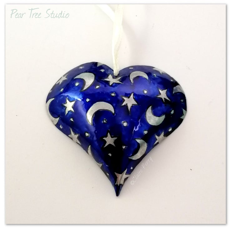 "This handmade Small metal heart hanging decoration features a beautiful blue colour with an intricate stars and moons pattern adds a whimsical and celestial feel." Perfect as a unique addition to your home décor or as a wonderful gift for birthdays, anniversaries, or holidays.