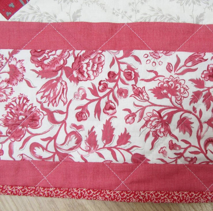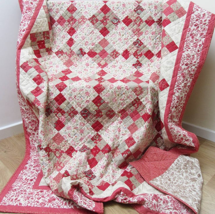A quilt made in traditional block style using sumptuous cotton prints from the Moda Rouennieries Deux collection. Shades of red, pink-red, cream and grey give this quilt a wonderfully softened, antique look. A beautiful sofa or bed throw.