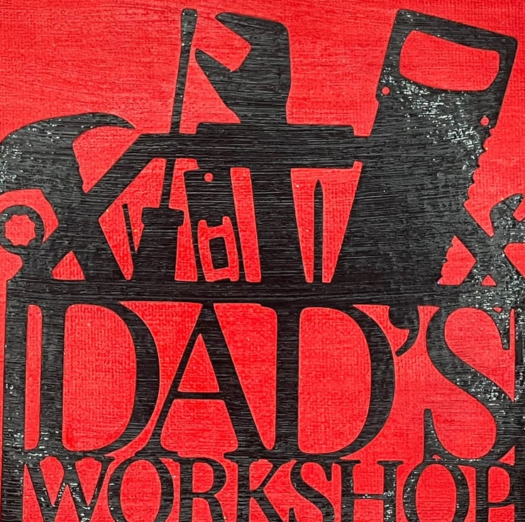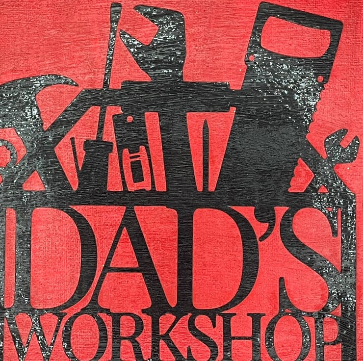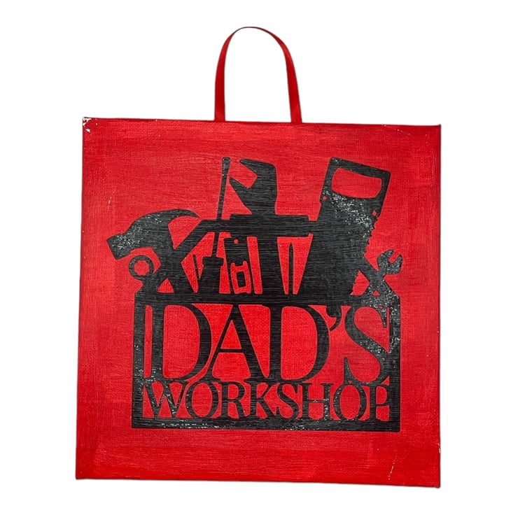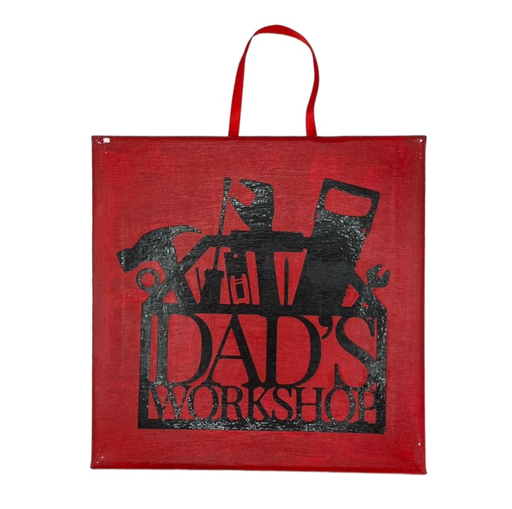 This red canvas wall art features a unique design that showcases a workshop scene, including various tools such as a hammer, wrench, and screwdriver. This wall canvas would be a great addition to any dad’s ‘man cave’ or work area.