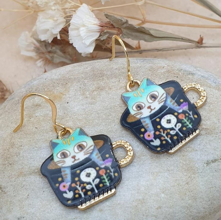 18 karat gold plated hypoallergenic earrings featuring cute kitsch cat in a teacup charms