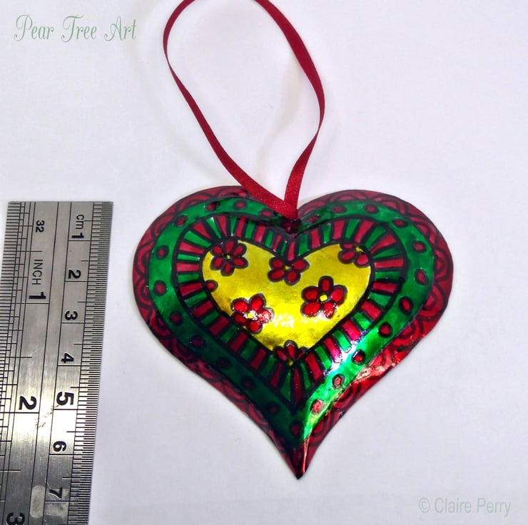 This Tin Heart decoration has been cut out of a coffee tin and embossed into shape using hammers and hand painted.