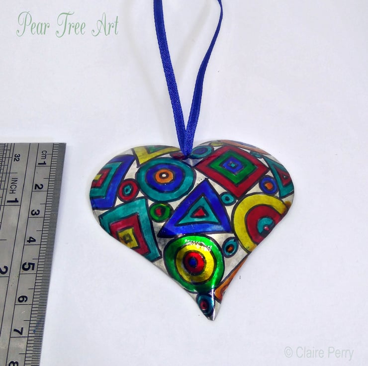 Handmade Small Metal Heart Decoration with abstract pattern. Multi-Coloured.