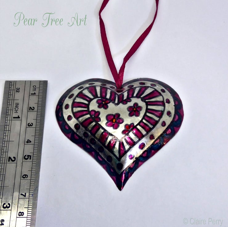 This Tin Heart decoration has been cut out of a coffee tin and embossed into shape using hammers and hand painted.