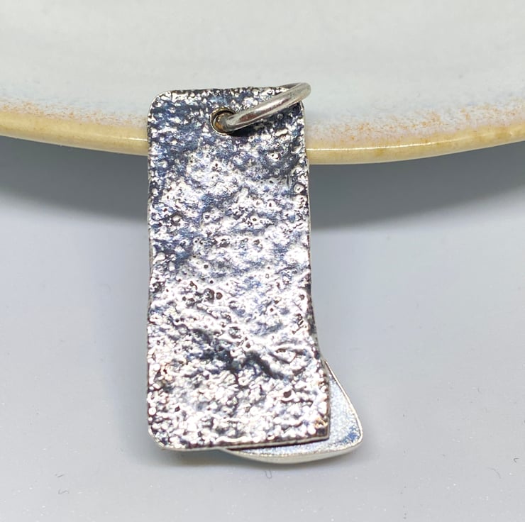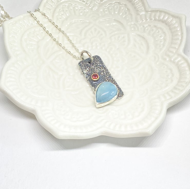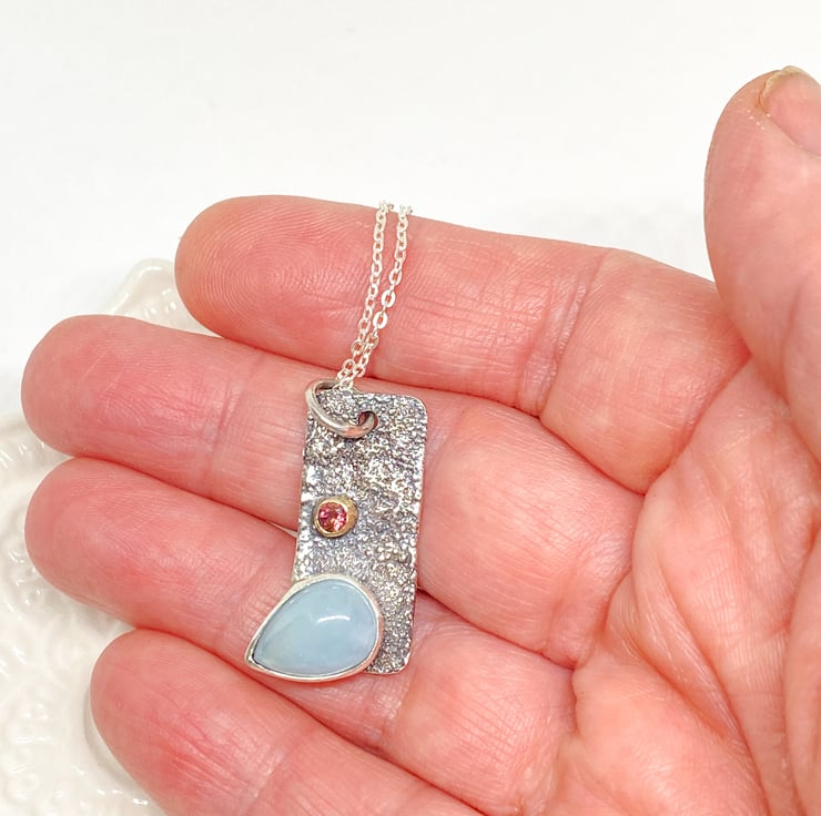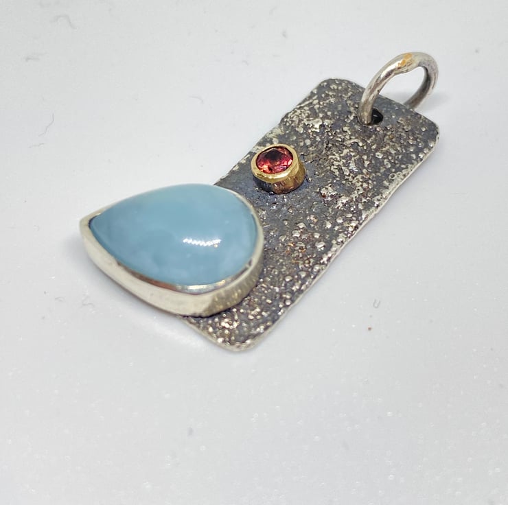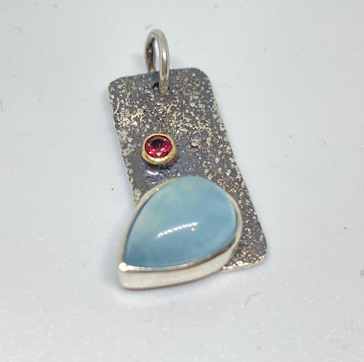 Teardrop Aquamarine and pink tourmaline. The aquamarine has been set in sterling silver and the tourmaline in 9ct gold. The backplate has been textured and patinated giving a unique look.