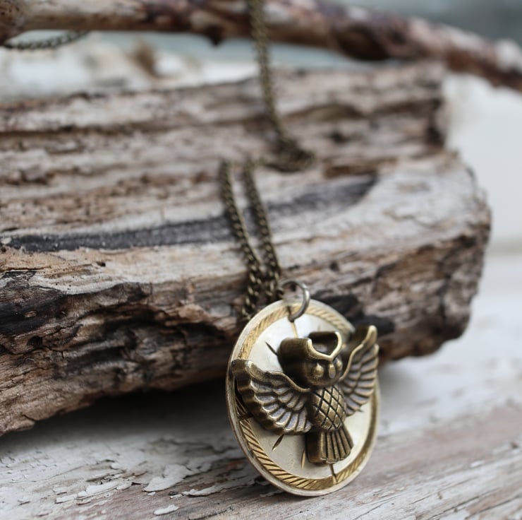 Upcycled steampunk theme - vintage watch dial - owl necklace - handmade