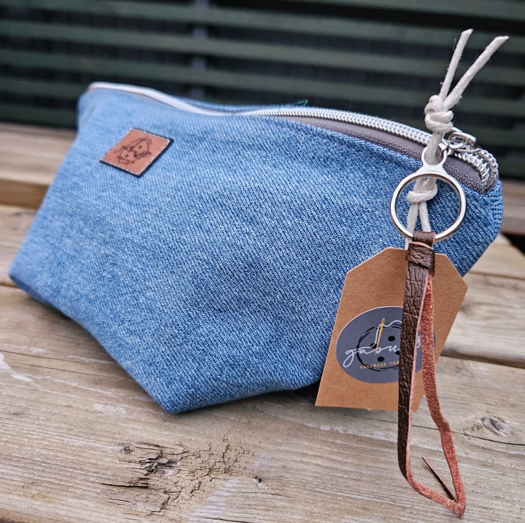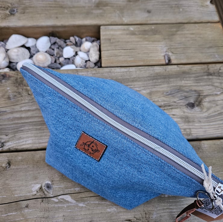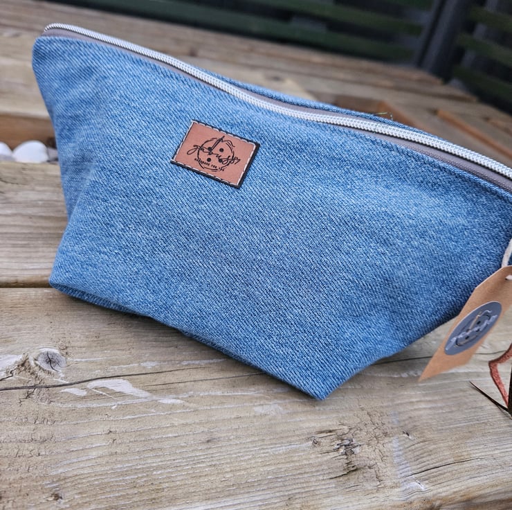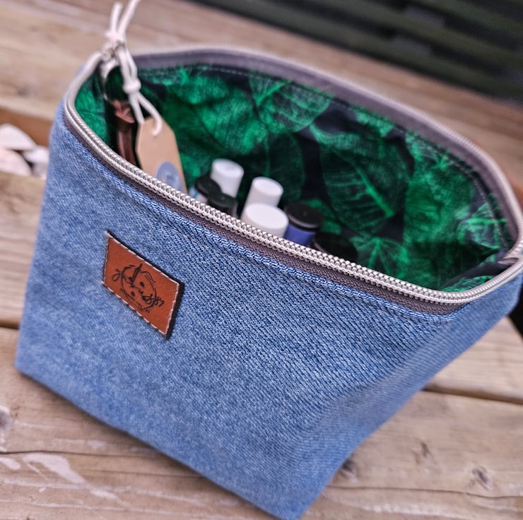 An interesting and ideal make-up bag in repurposed denim. When opened it looks like a small fabric basket, it does not fall over.