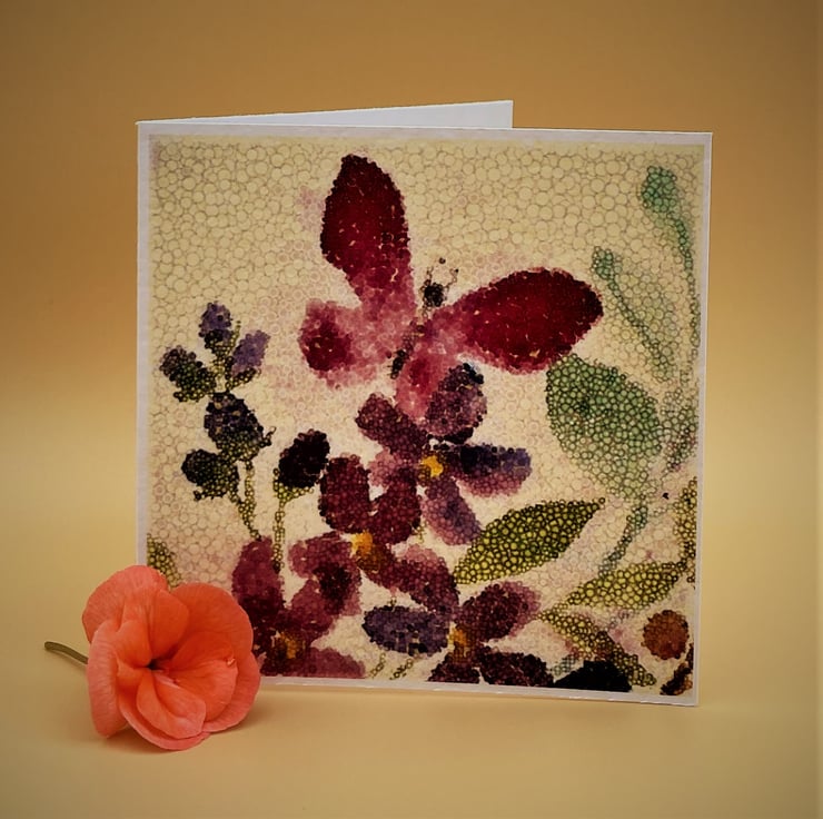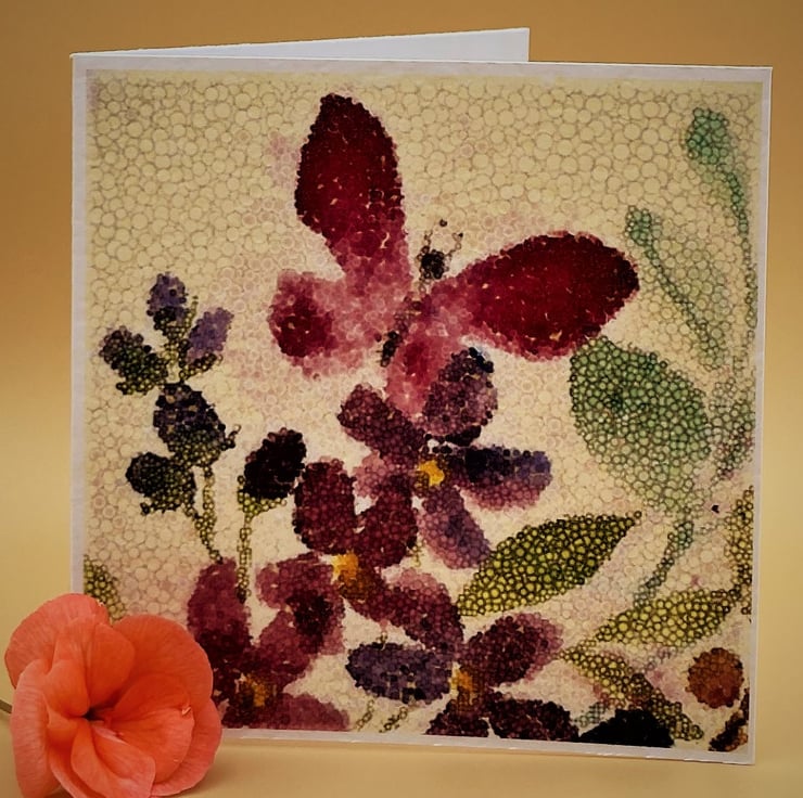 This blank Greetings Card shows a Pink Butterfly, Purple Periwinkle flowers, and green leaves - there is no message inside. Taken from one of my original watercolour paintings this little card is a charming way to send your own greetings on any occasion. The colours are subtly muted and the card image is manipulated to give a slight mosaic finish which I think lends it an 'antique Italian' touch.