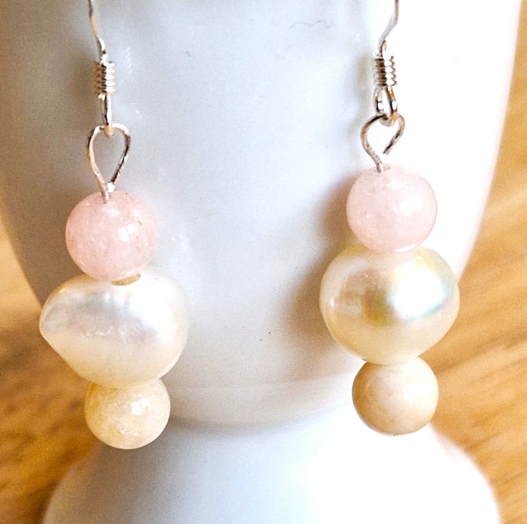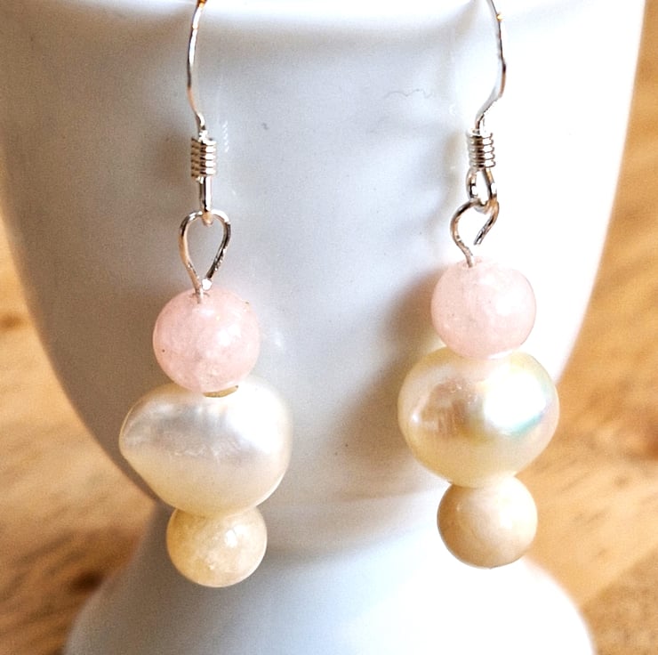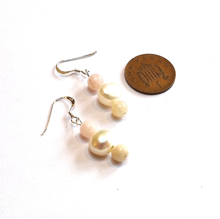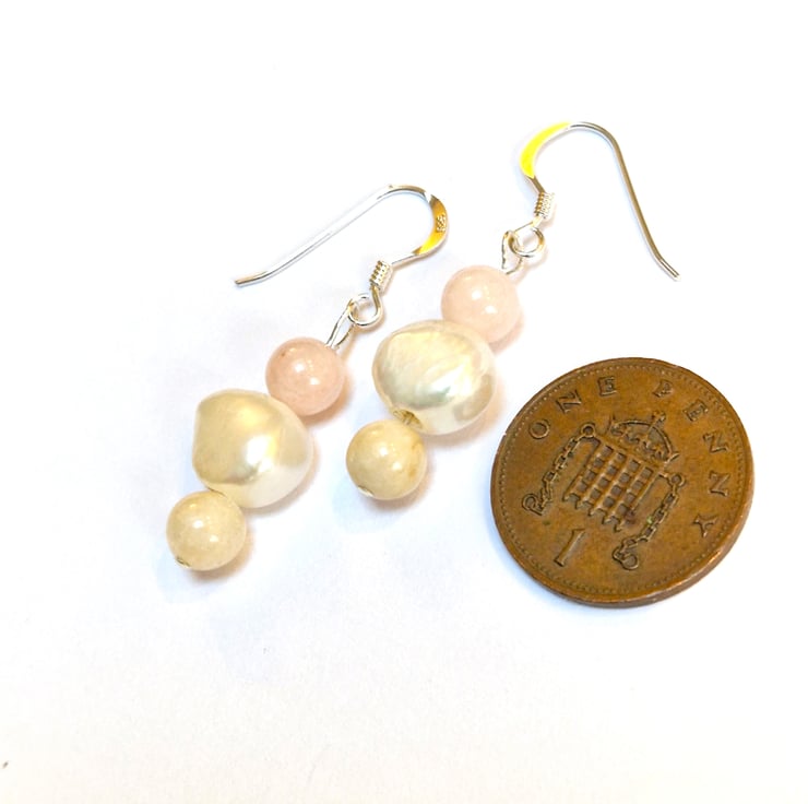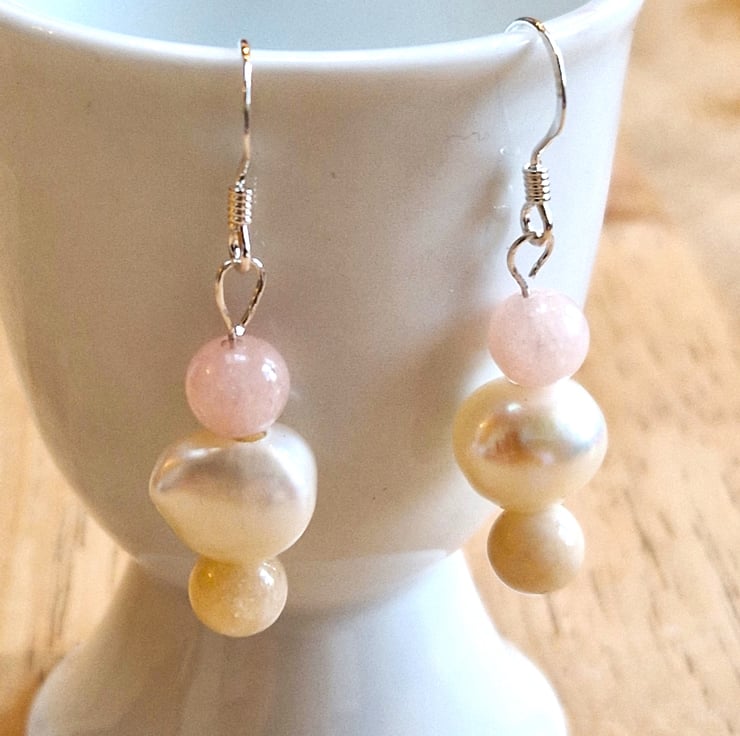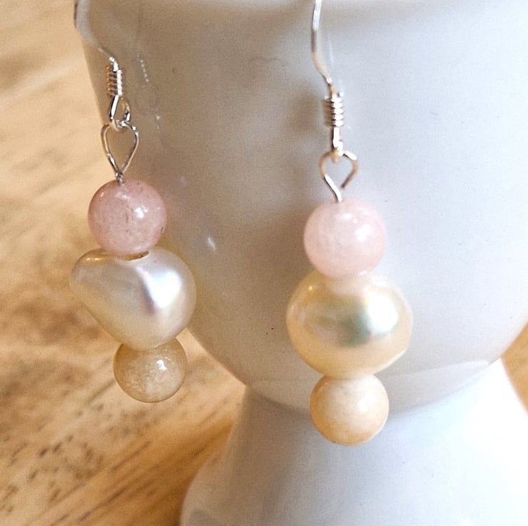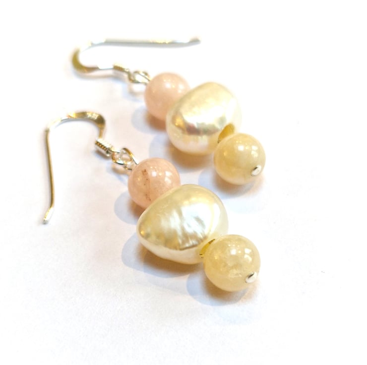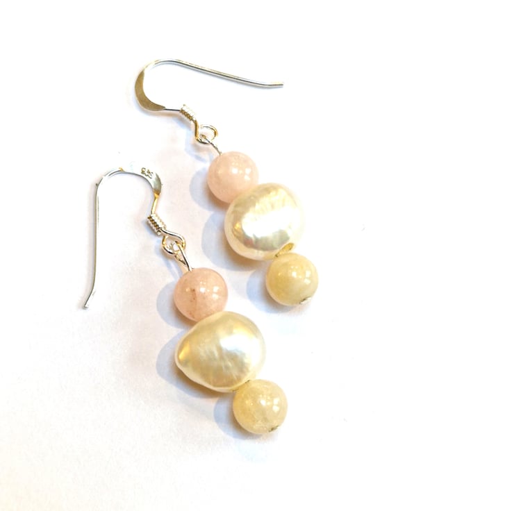Pretty sterling silver dangle earrings with irregular freshwater Pearls and Morganite stone beads in pastel pink and creamy pale yellow,