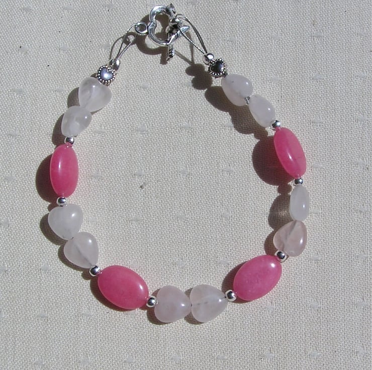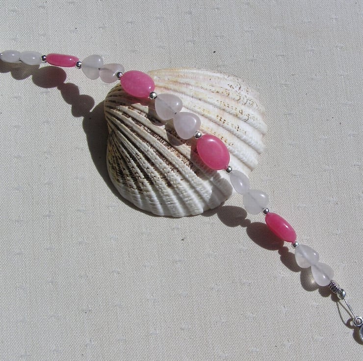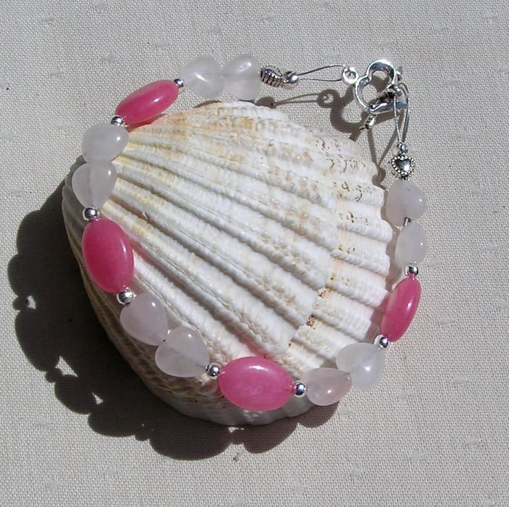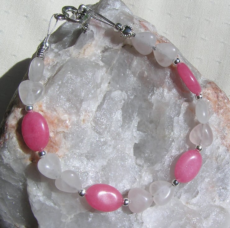 This Stunning Bracelet is made from Pink Morganite & Rose Quartz - Bright Candy Pink Morganite Oval beads separated by Rose Quartz Hearts and tiny Silver spacers - a Beautiful Romantic combination that will look stunning either worn casually or with something more Elegant for a Special Evening out