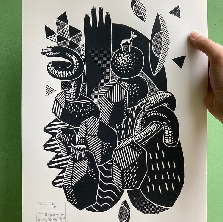 Happenings in Donkey World No.13 one-colour A3 linocut screen-print