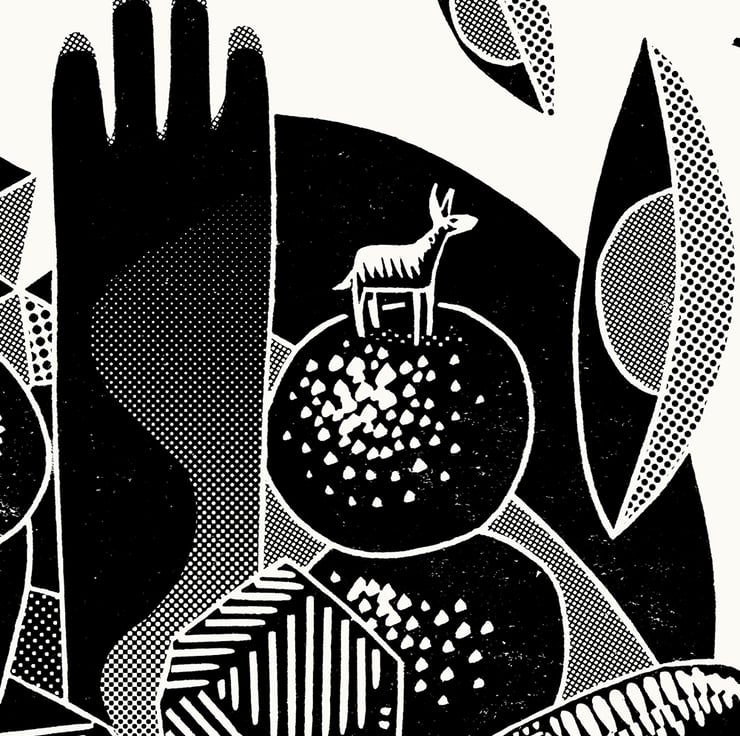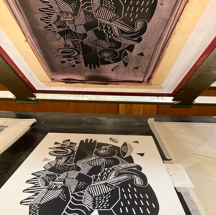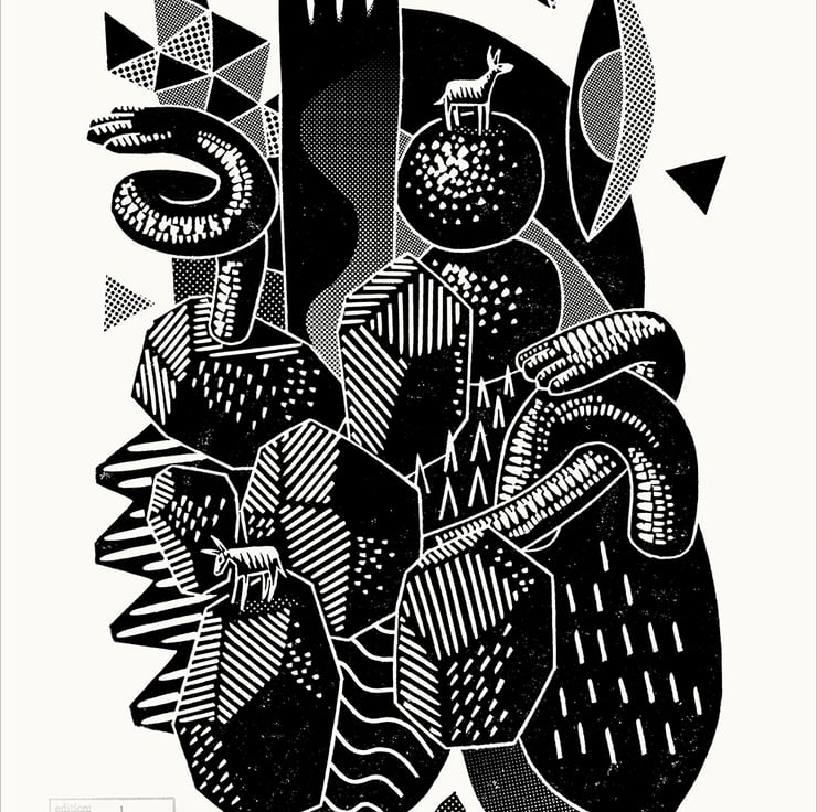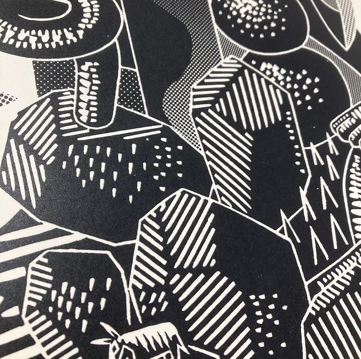 Black System 3 ink on off white/cream Munken 250gsm acid-free paper. From an edition of only 40, signed, stamped, titled and numbered. The print started out as a linocut. I then added the halftones (spotty bits), before printing the edition as a screen-print.